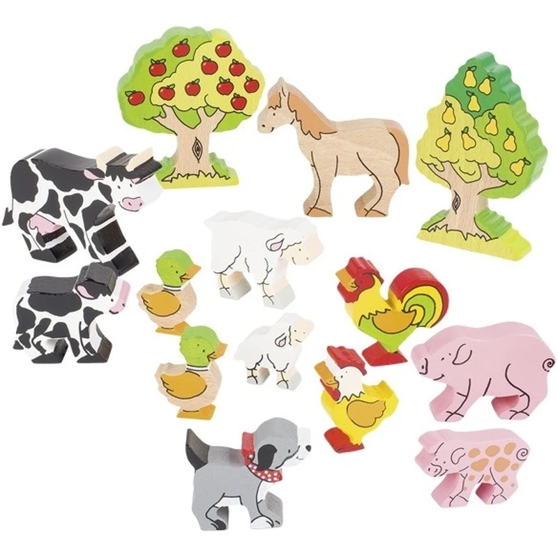 Setul include 14 piese din lemn, dintre care 12 animale si 2 pomi.