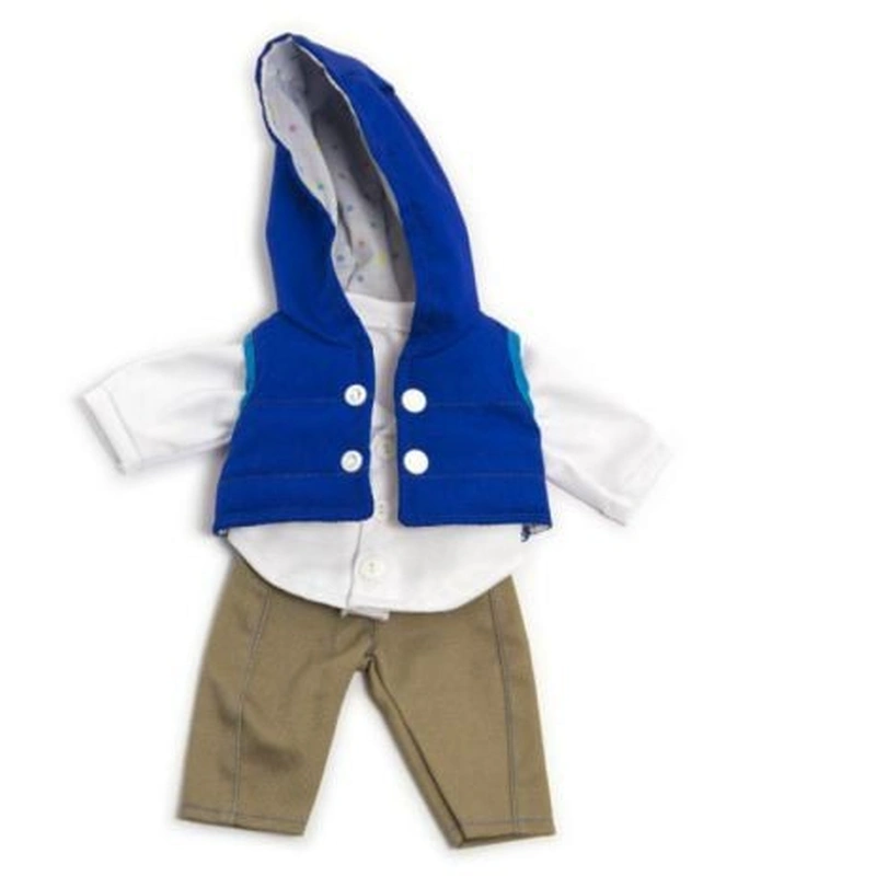 Setul include o vesta cu glugă bleumarin, cămașă polkadot roz deschis și alb și pantaloni kaki - perfectă pentru toamnă!