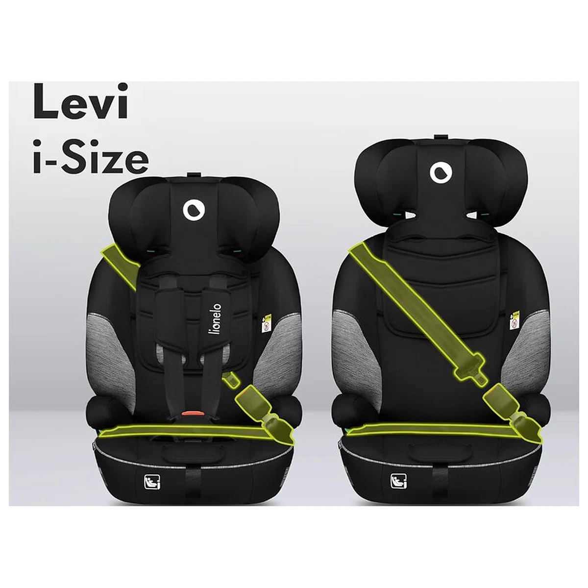 Scaunul este proiectat pentru instalarea FWF, adica orientat spre inainte. Levi One i-Size este atasat cu centurile de siguranta ale masinii, astfel incat scaunul se potriveste aproape oricarui model de masina. Copiii cu inaltimea de 76-105 cm ar trebui sa fie prinsi cu centurile de siguranta ale masinii si un ham pentru scaun in 5 puncte, in timp ce copiii mai mari (105-150 cm) trebuie sa fie fixati numai cu centurile de siguranta ale masinii. Cotierele confortabile mentin centura in pozitia corecta, iar indicatorii verzi indica directia corecta de instalare.