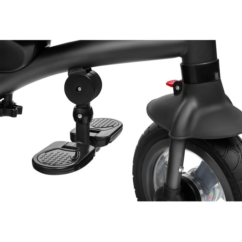 Rotile usoare ale modelului Tris, realizate din material PU de inalta calitate , asigura o aderenta excelenta si o absorbtie a socurilor. Deasupra rotii din fata exista un capac care protejeaza picioarele copilului si, de asemenea, actioneaza ca o aripa. Vehiculul are o capotina cu plasa integrata, care, la fel ca suportul pentru picioare si bara de protectie, poate fi usor demontat.