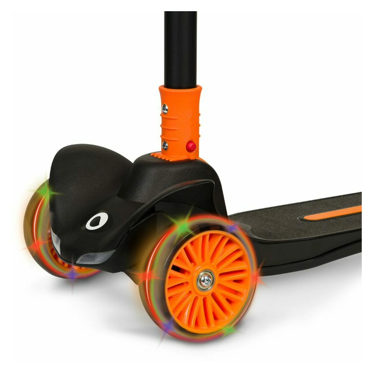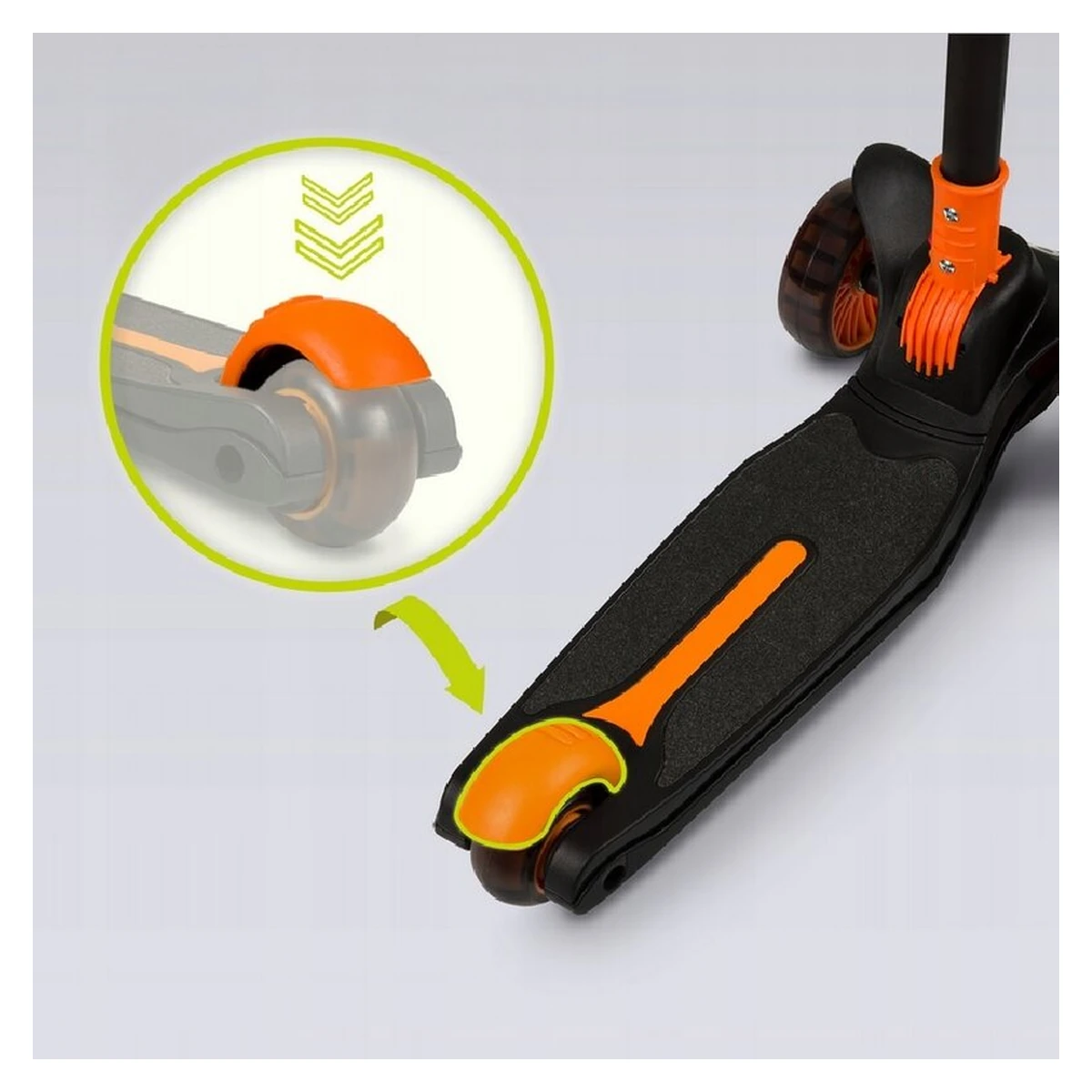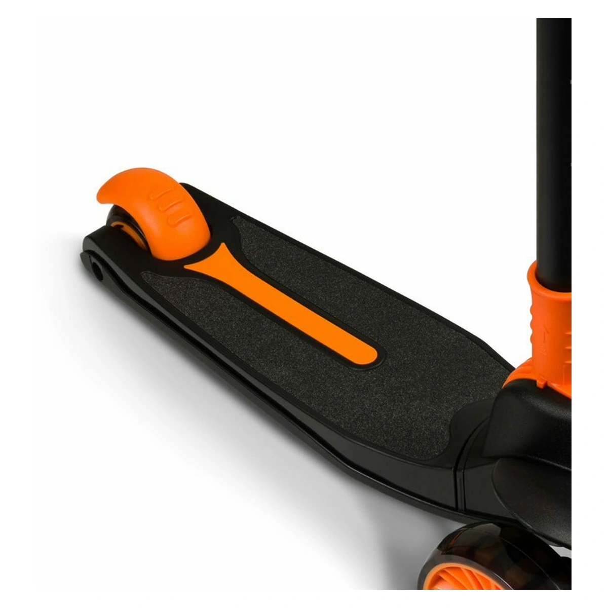 Scuterul nostru Lionelo Timmy Orange Black atrage atentia prin designul sau unic si culoarea caracteristica. Suntem convinsi ca micutului tau ii va placea de la prima vedere, iar acest lucru se datoreaza, printre altele, si luminilor LED alimentate de miscare, care se regasesc in roti si in platforma (o alimentare pe baza de baterii AA este suficienta pentru aproximativ 50 de ore de utilizare).
