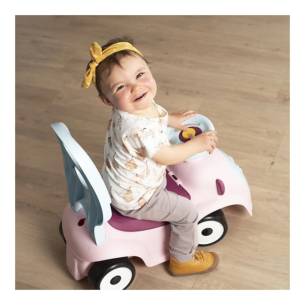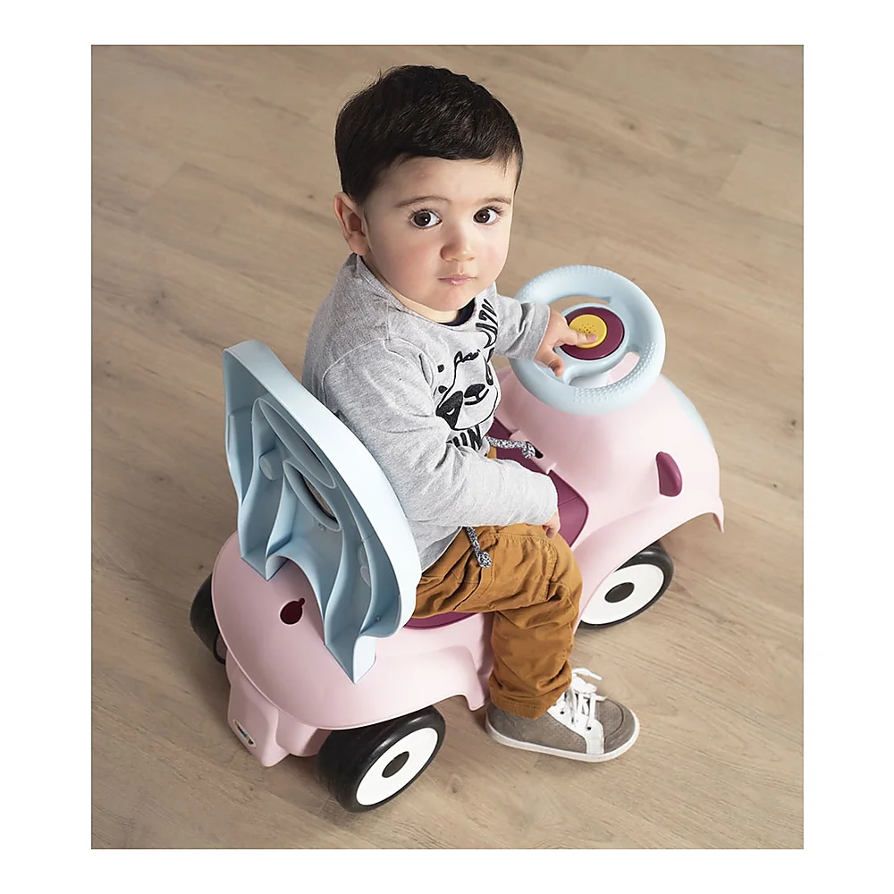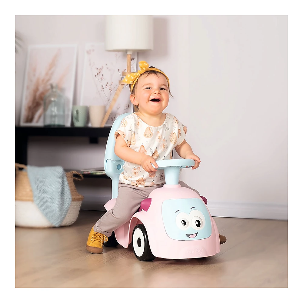 Sub scaun este pozitionat un compartiment de depozitare pentru jucariile celui mic."Ochii mobili" ai acesteia vor putea schimba infatisarea fetei masinutei in timpul condusului