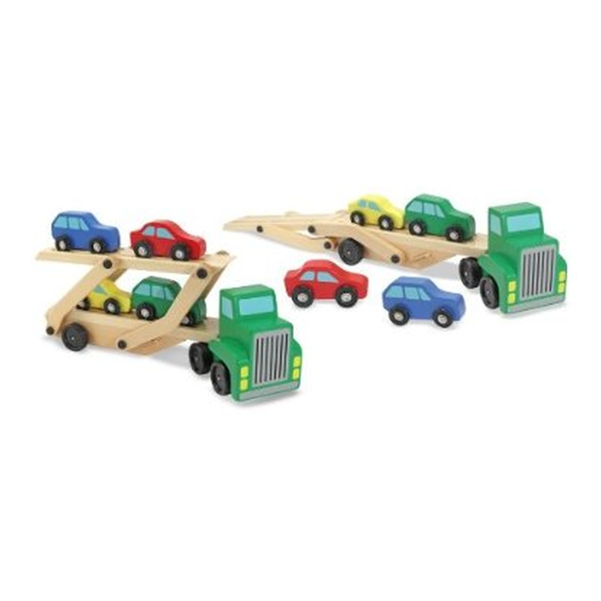 Un camion fantastic, cu 6 roti, 2 platforme pentru carat masini (platforma de sus este mobila) si 4 masinute in culori stralucitoare, toate din lemn de cea mai buna calitate. Micutii iubitori de masini vor fi incantati sa transporte peste tot masinutele, sa le incarce si descarce de pe platforme.