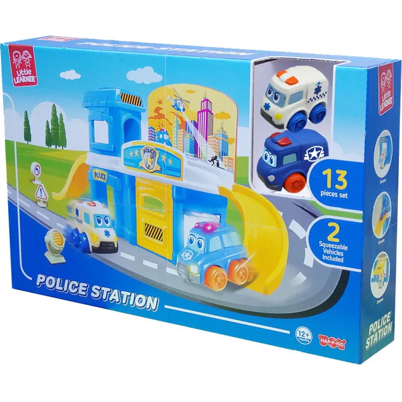 Setul include 11 piese de joc: 2 masinute, semne circulatie, rampe, piese pentru asamblat sectia de politie.