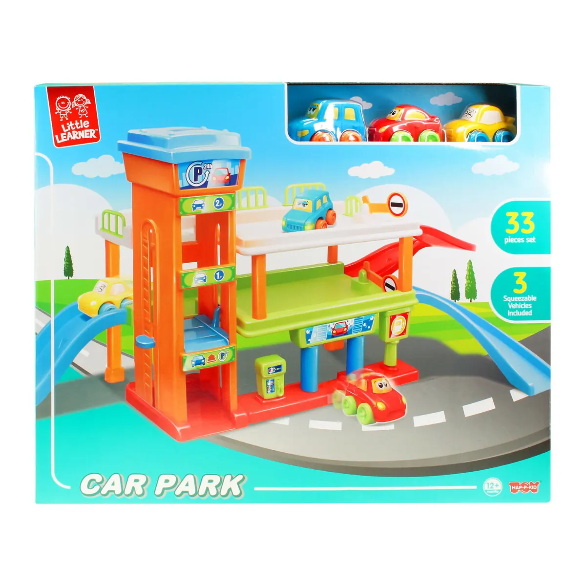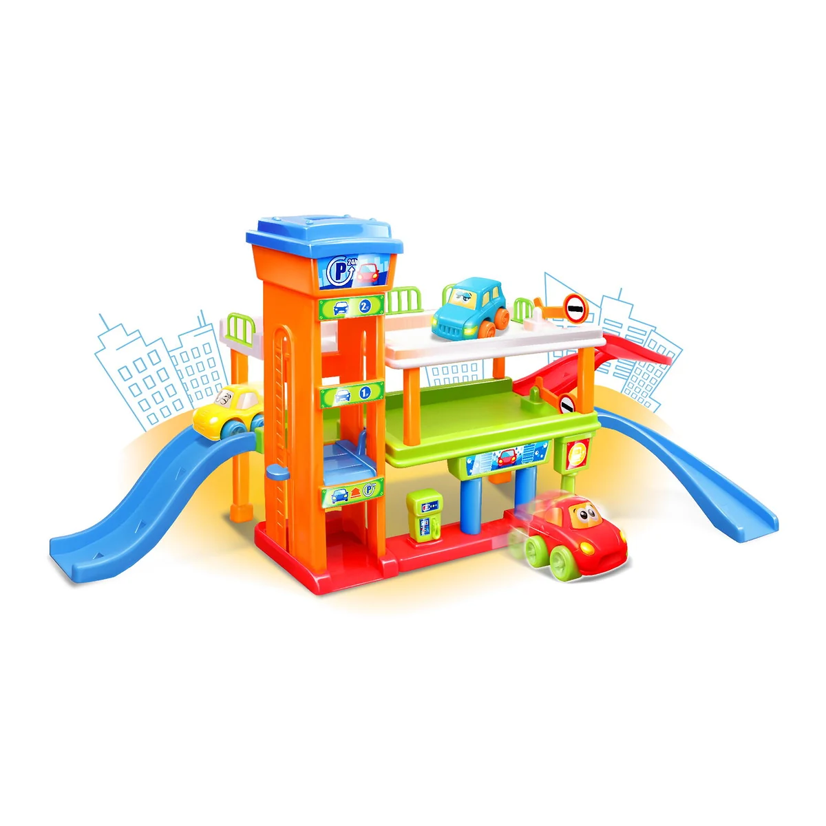 Setul include 33 piese: 3 masinute, rampe, parcari supraetajate, benzinarie, spalatorie auto etc.