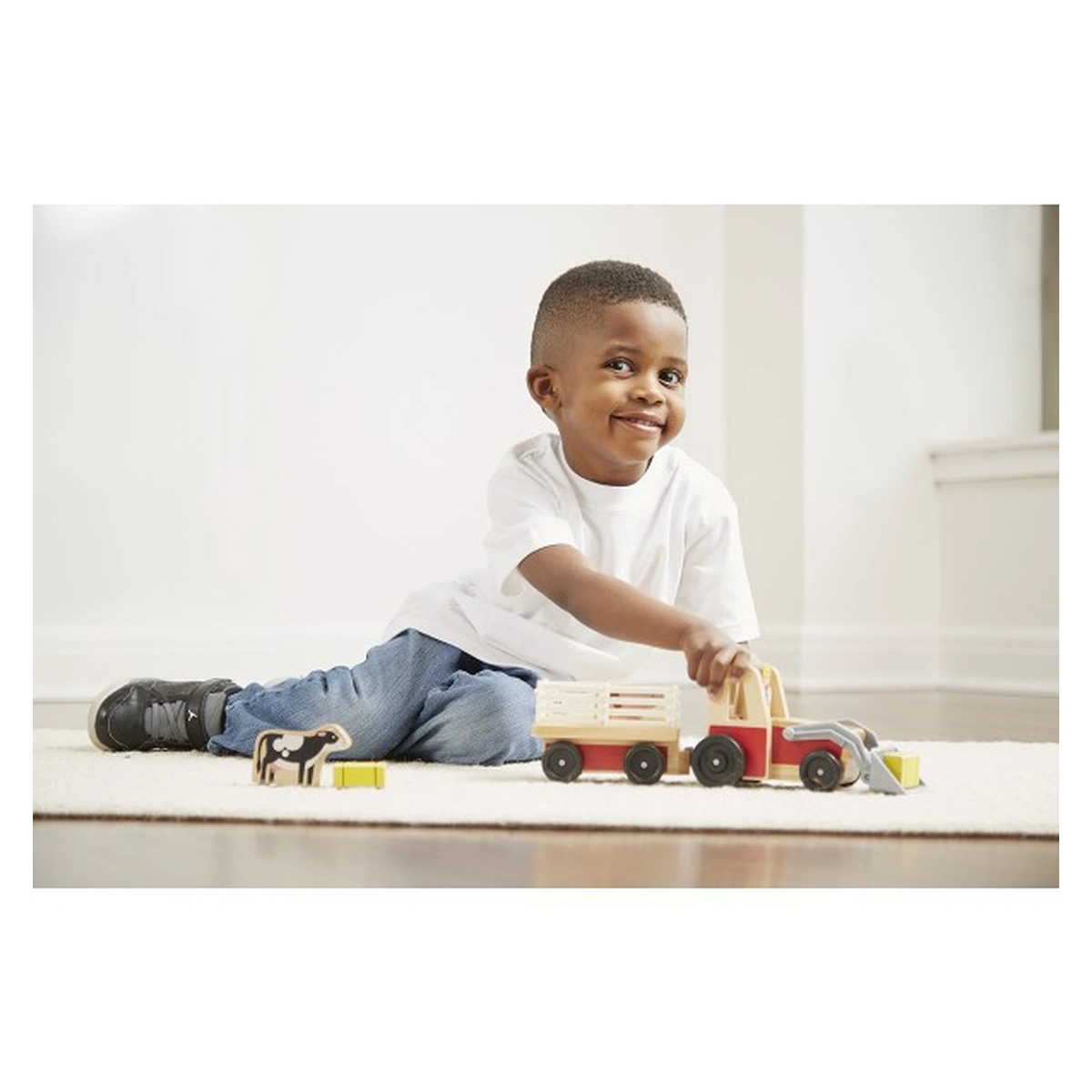 1. Aliniaza piesele de joc (baloti de fân, animale, gard și fermierul) și cere copilului să le numere. Apoi adreseaza-i intrebari de genul Cati oameni sunt acolo? Câte animale? Câte piese sunt in total?