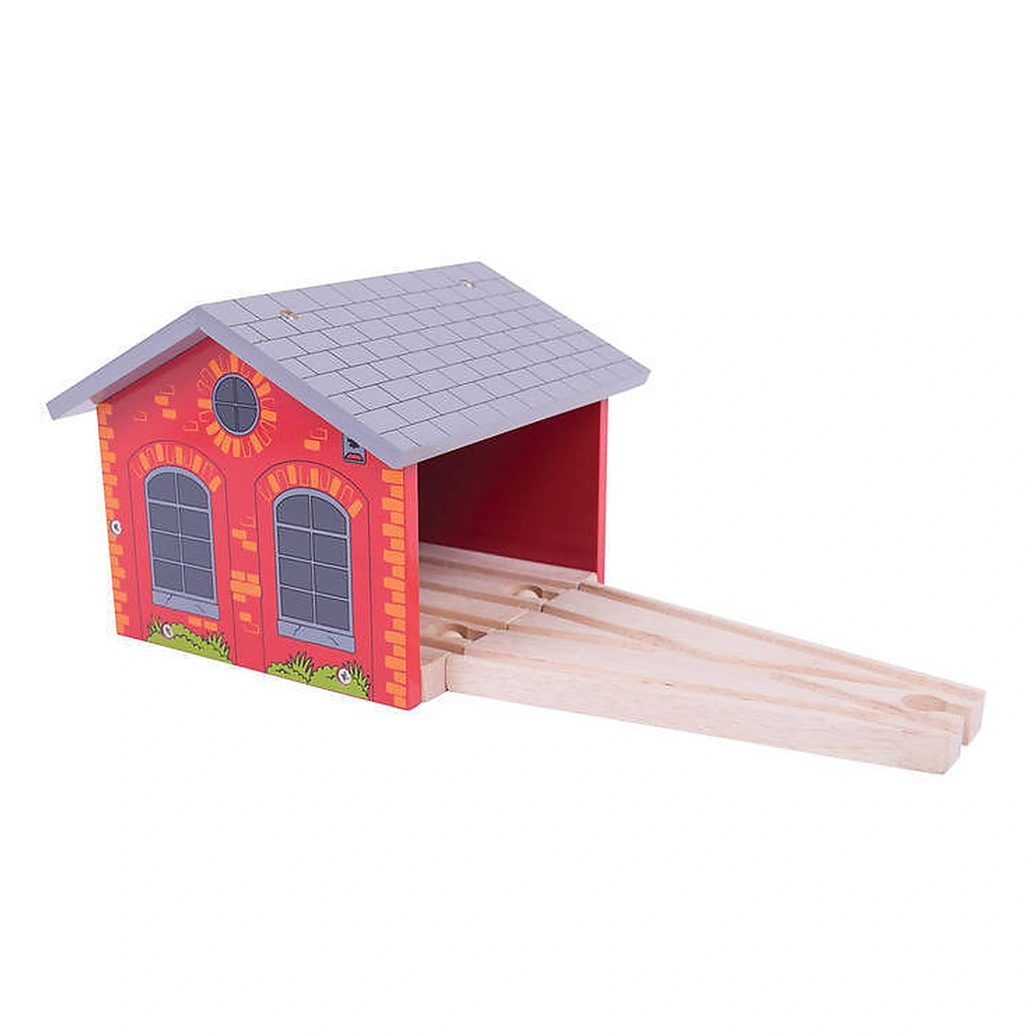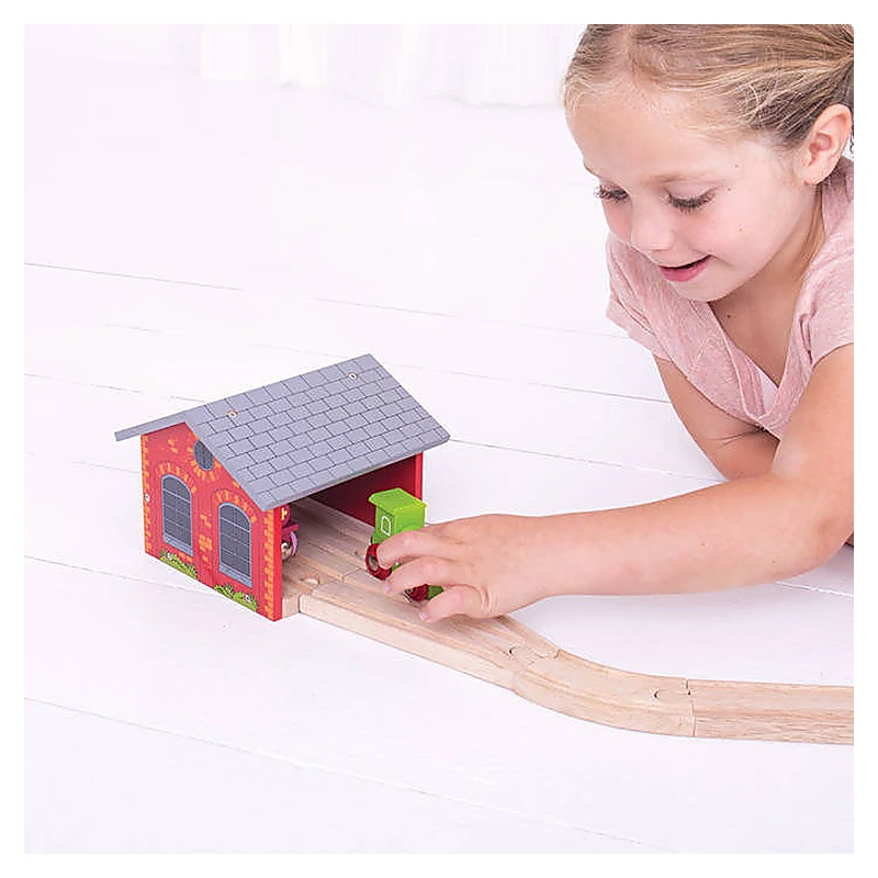 Este loc pentru 2 locomotive in acest hangar din lemn cu multe detalii. Hangarul are o sina dubla despicata care conduce fiecare locomotiva la locul ei de odihna. In plus, hangarul are un acoperis detasabil care le permite micilor mecanici sa supravegheze cu usurinta reparatiile sau alte activitati de intretinere.