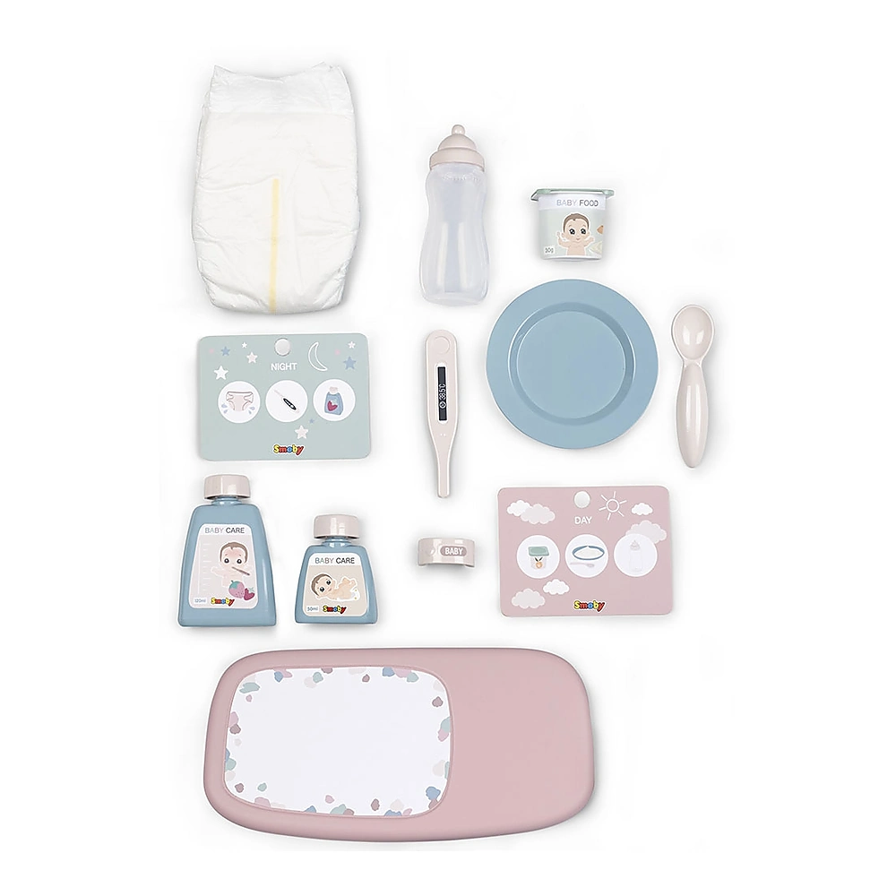 - In set puteti gasii 13 accesorii: 2 cutii de carton, 1 lingura, 1 farfurie, 1 sticla, 1 scutec, 1 termometru, 1 sticla de sirop, 1 sticla de crema pentru bebelusi, 1 iaurt, etc.