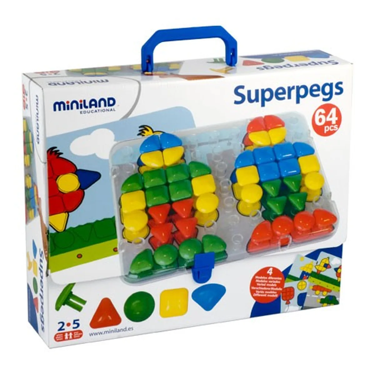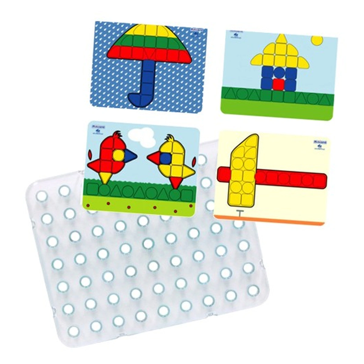 Setul include 64 de piese de mozaic mari in 4 culori primare: rosu, verde, albastru si galben.