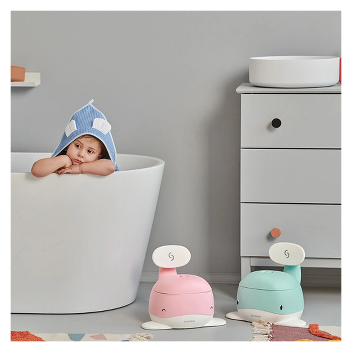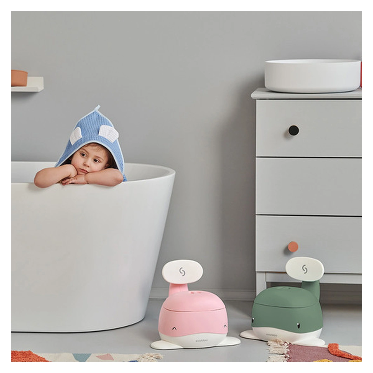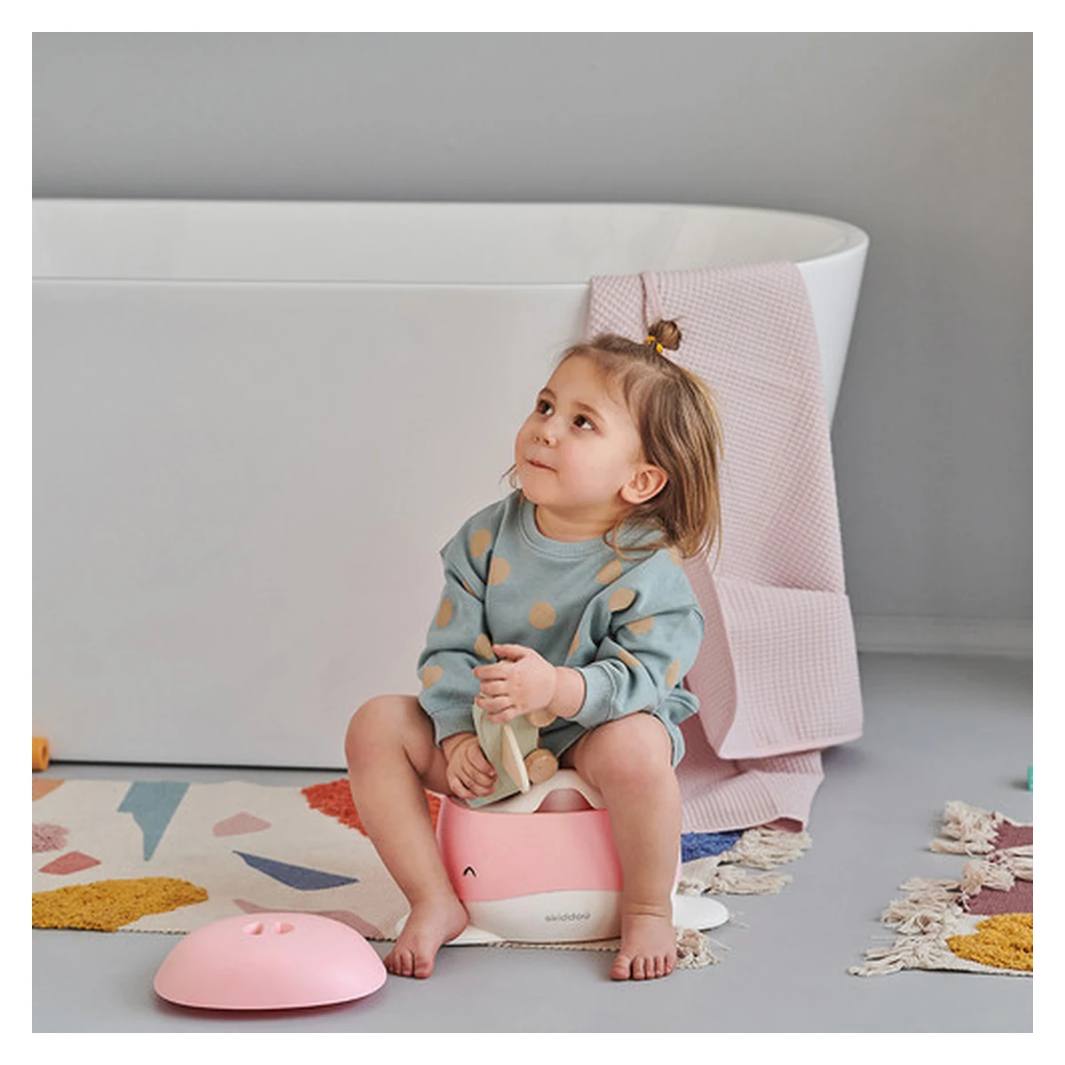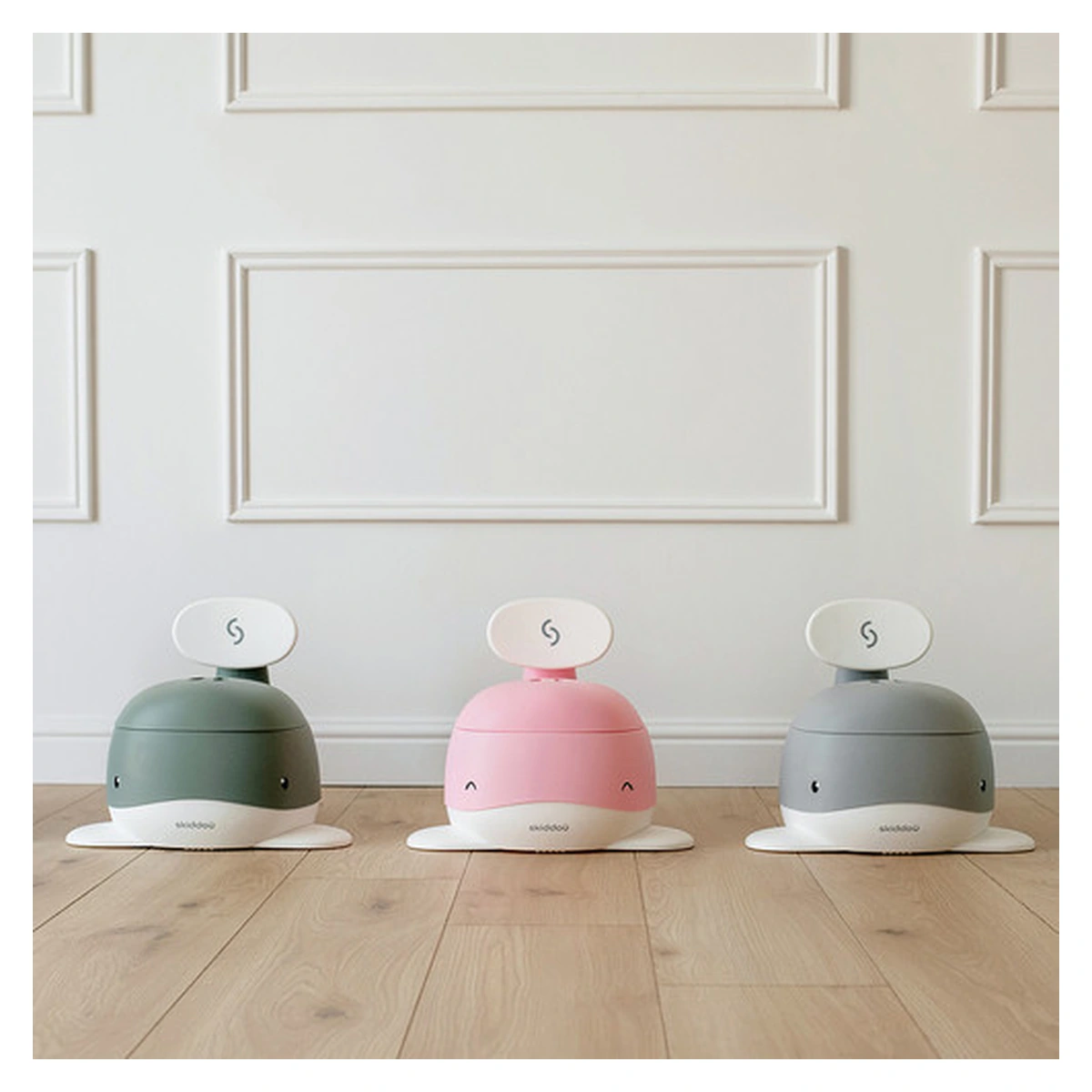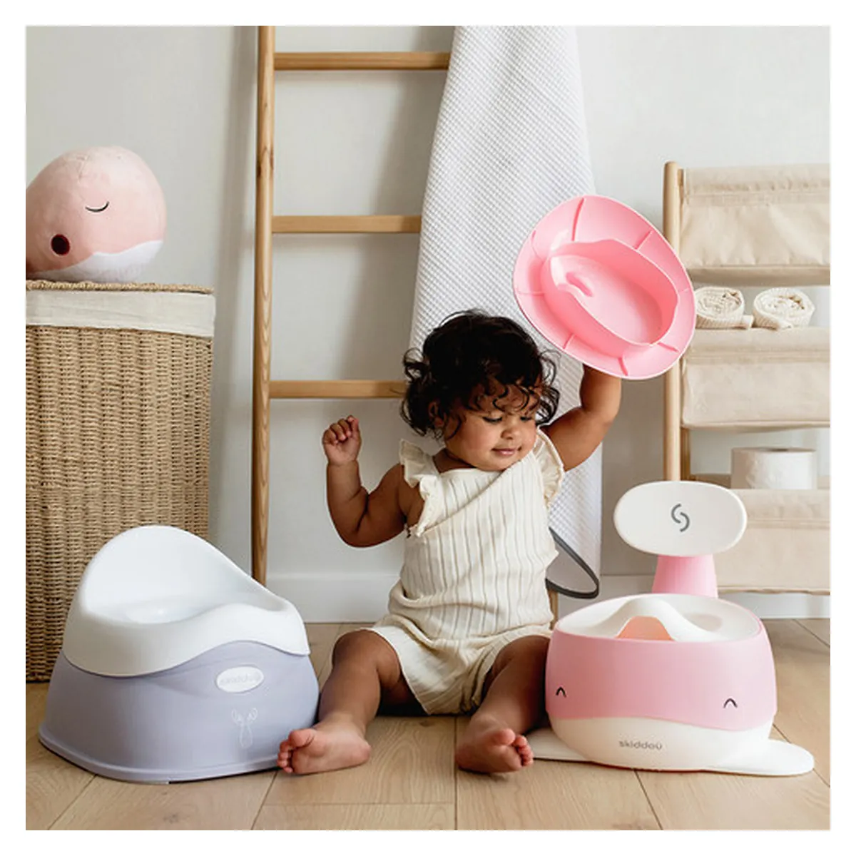 Olita pentru copii Pottili cu capac in forma de balenuta de la Skiddou este ideala pentru realizarea cu usurinta a tranzitiei de la scutec la toaleta pentru adulti, reprezentand etapa intermediara acestora.