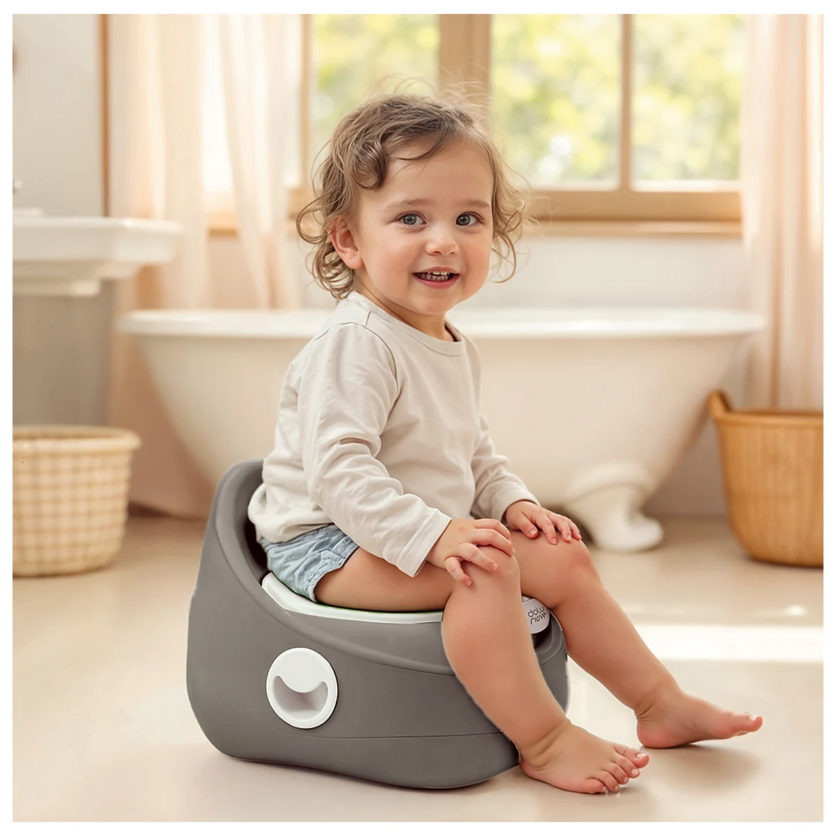 Olita portabila – Gri este o solutie practica si confortabila, care ii ajuta pe cei mici sa invete folosirea toaletei intr-un mod placut si sigur