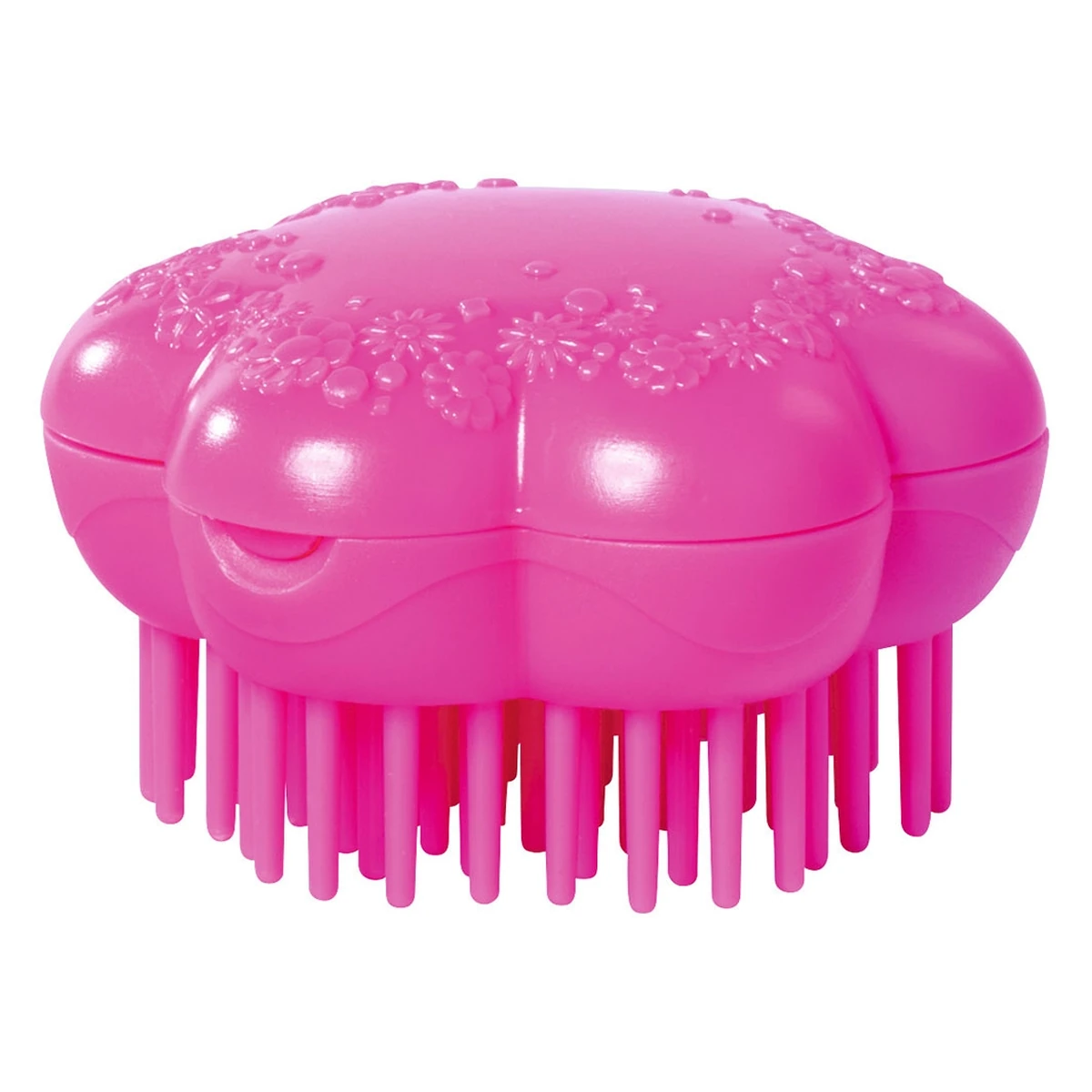Pe langa diverse margele colorate si elastice, setul contine si o perie roz cu design floral pentru pieptanat parul cu functie de depozitare