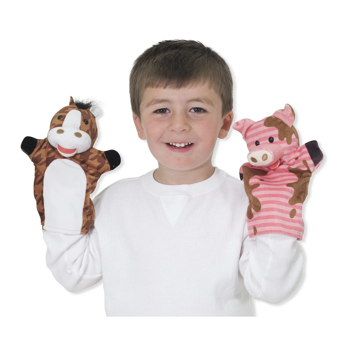 Setul include 4 papusi de mana: oita, purcelus, vacuta si calut.