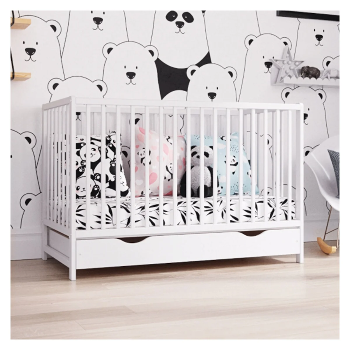 • Este realizat din lemn masiv si semifabricate din lemn (PAL), beneficiaza de finisaje de exceptie, partile patutului sunt tratate cu vopsele si lacuri ecologice pe baza de apa conform normelor si reglementarilor Europene, somiera nu este tratata cu vopsea, nu reprezinta nici un pericol pentru sanatatea celui mic.