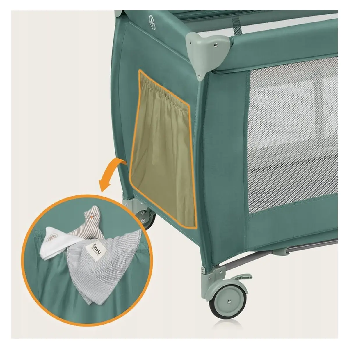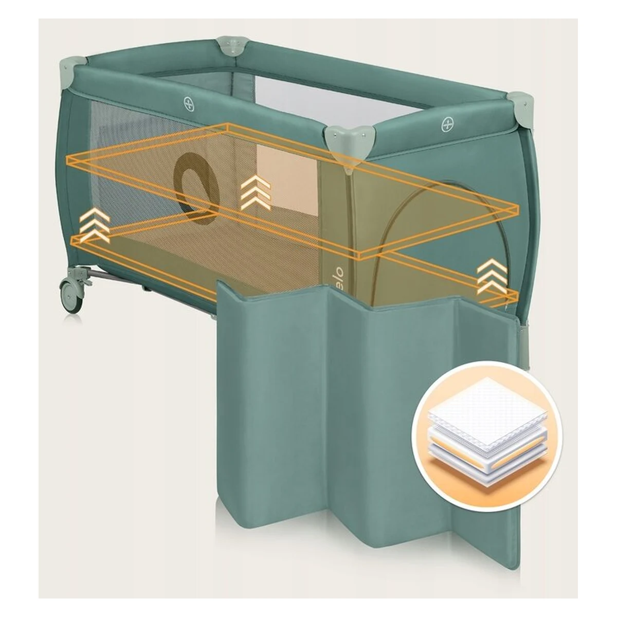 Patut pliant, Lionelo, Stefi Plus, Cu doua nivele, Cu intrare laterala cu fermoar, 2 roti, 120 x 60 cm, Verde Olive