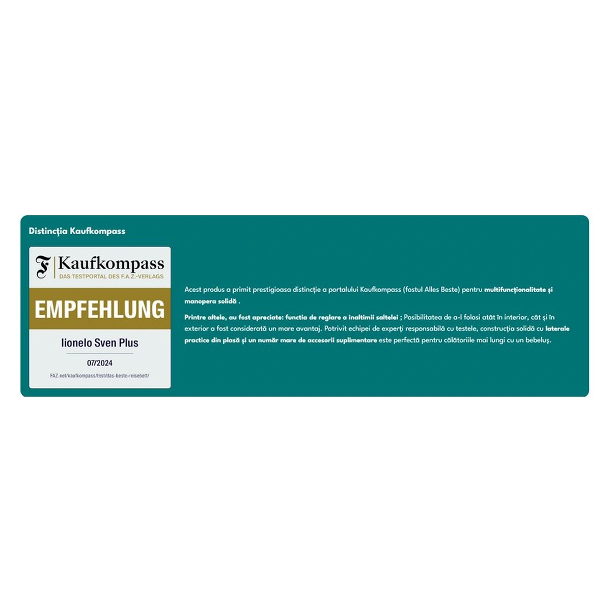 Produs premiat: acest model a primit distinctia portalului Kaufkompass (fostul Alles Beste) pentru multifunctionalitate si calitatea executiei. Au fost apreciate reglajul inaltimii saltelei, utilizarea atat in interior, cat si in exterior, precum și constructia solida cu laterale din plasa si numarul mare de accesorii, fiind considerat o alegere foarte buna pentru calatorii mai lungi alaturi de bebelus.