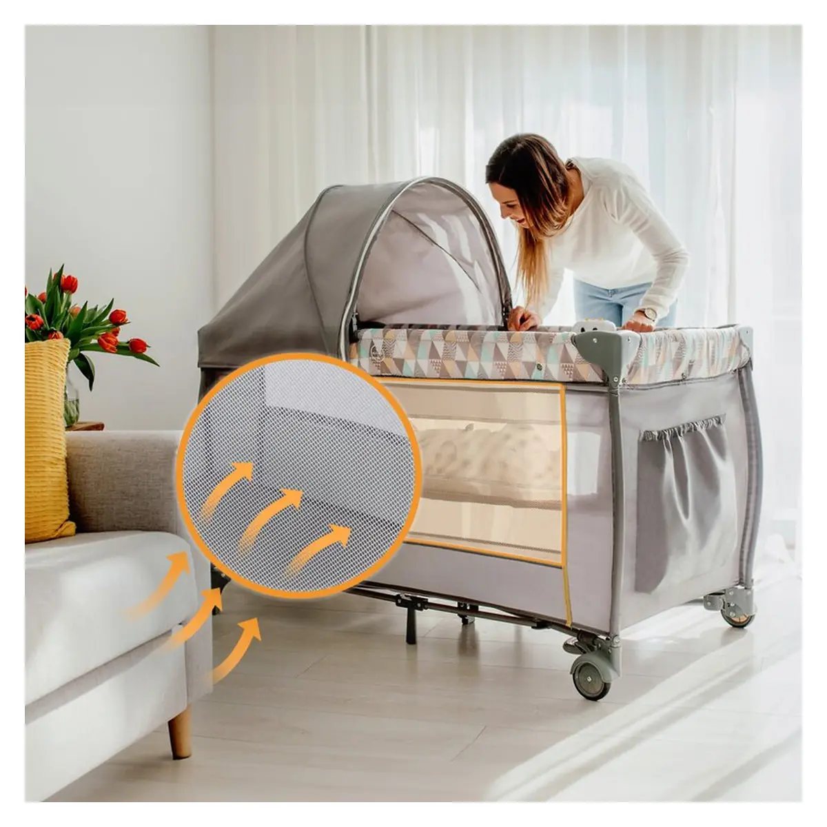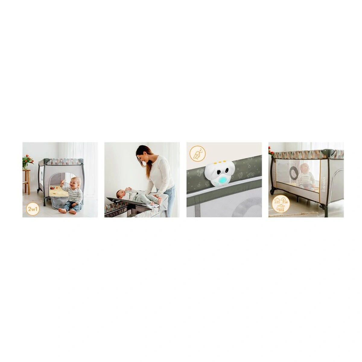 2 in 1 – patut de somn si tarc: ofera un loc confortabil si portabil pentru odihna si, separat, un spatiu sigur de joaca, inclusiv in aer liber, ceea ce il face util in multe contexte si locatii.
