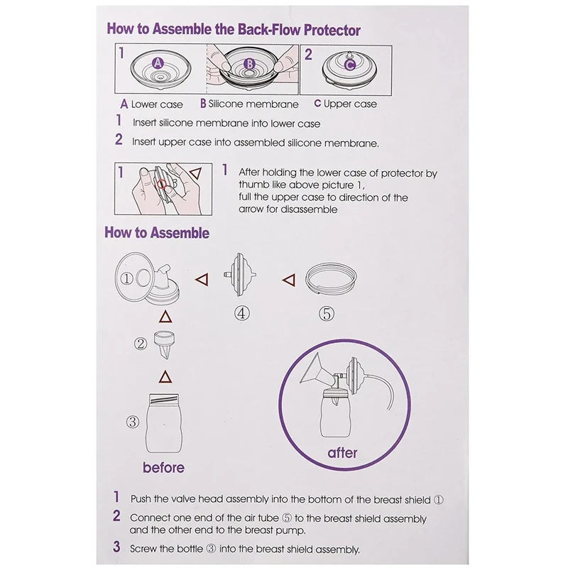 Atentie! Acest produs este un accesoriu pentru dispozitive medicale si are un caracter igienico - sanitar. El nu se returneaza, daca a fost desigilat conform Art. 16 lit. e). Componentele care intra in contact cu laptele trebuiesc sterilizate inainte de fiecare utilizare. Laptele matern poate fi stocat 72 de ore in frigider si pana la 3 luni in congelator. Laptele matern nu se incalzeste la microunde si nu se fierbe. Folosirea componentelor la mai multe persoane poate duce la transmiterea diverselor boli.