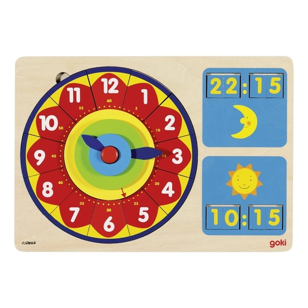 Puzzle-ul din lemn ceas cu 85 de piese din lemn ofera multe optiuni de joc si ajuta copilul sa determine variatia in timp de 12 si 24 de ore.Ceasul din lemn are ore, minute si cifre care se deplaseaza in forma de piese de puzzle pe care copilul va trebui sa le aranjeze in ordine corecta.Copilul nu invata doar sa foloseasca un ceas, ci invata si numerele s sa socoteasca.Placile cu numere sunt impartite in noapte si zi, iar copilul va invata repede cand este noapte, de exemplu 22:15, dar si ziua la ora 10:15.