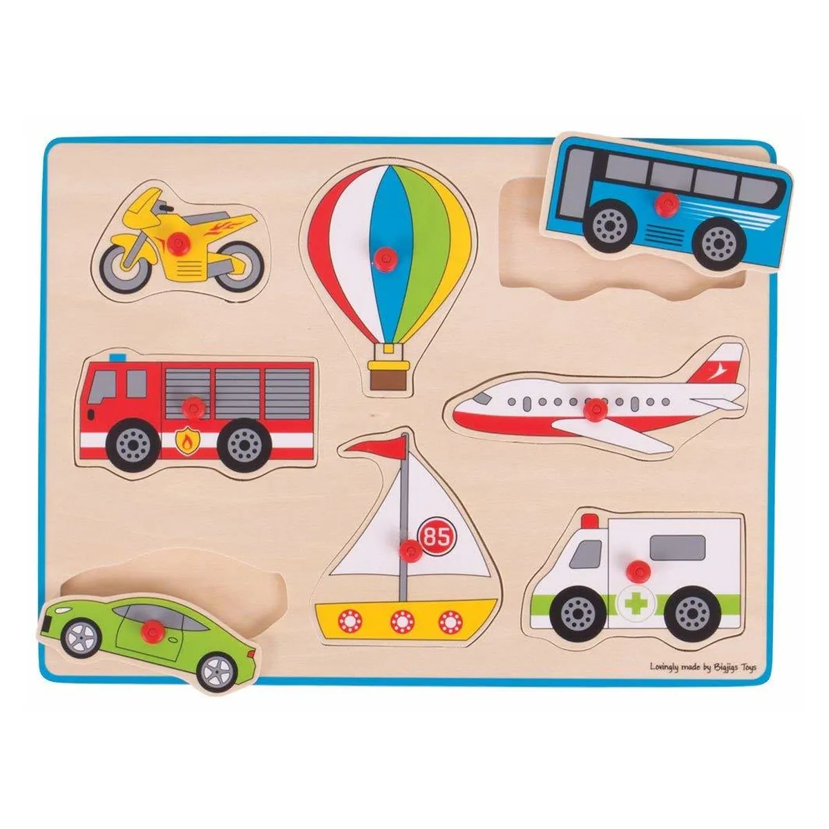 Include: 9 piese (motocicleta, balon, autobuz, masina de pompieri, barca, masina, barca, ambulanta)