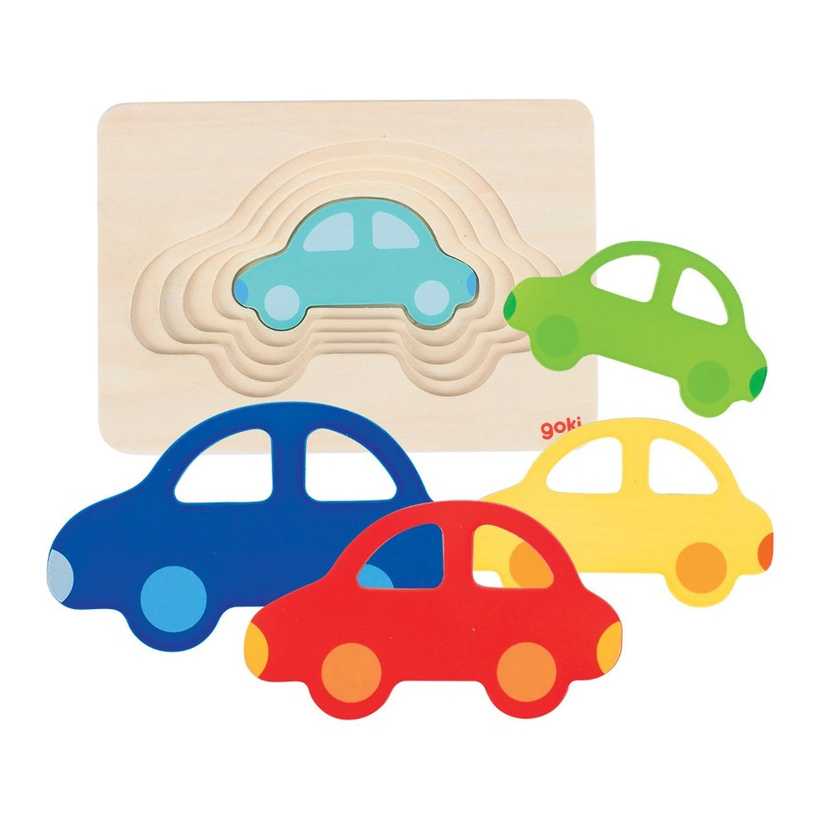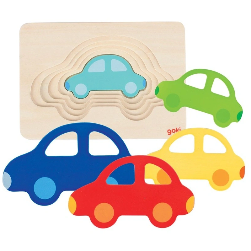 Puzzle din lemn stratificat compus din 5 piese care se potrivesc una peste alta.