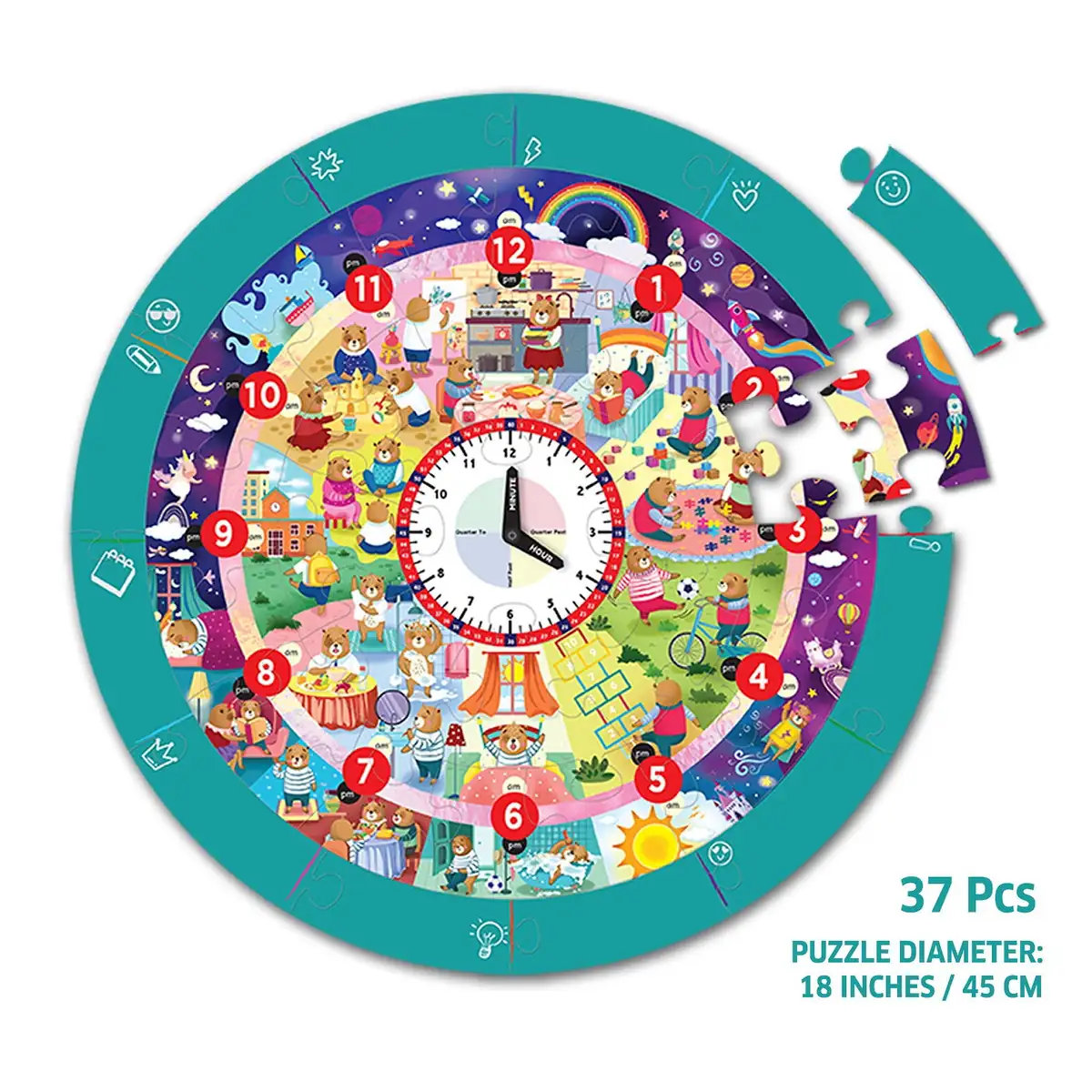 - Construirea si jocul cu puzzle-ul ii va face curiosi pe copii cu privire la timp. Ei voi invata sa vizualizeze timpul, sa citeasca ceasul si sa spuna ora, dar si sa recunoasa numerele, sa numere de la 1 -60, sa numere din 5 in 5, sa inteleaga conceptul de fractie si diferenta dintre AM si PM