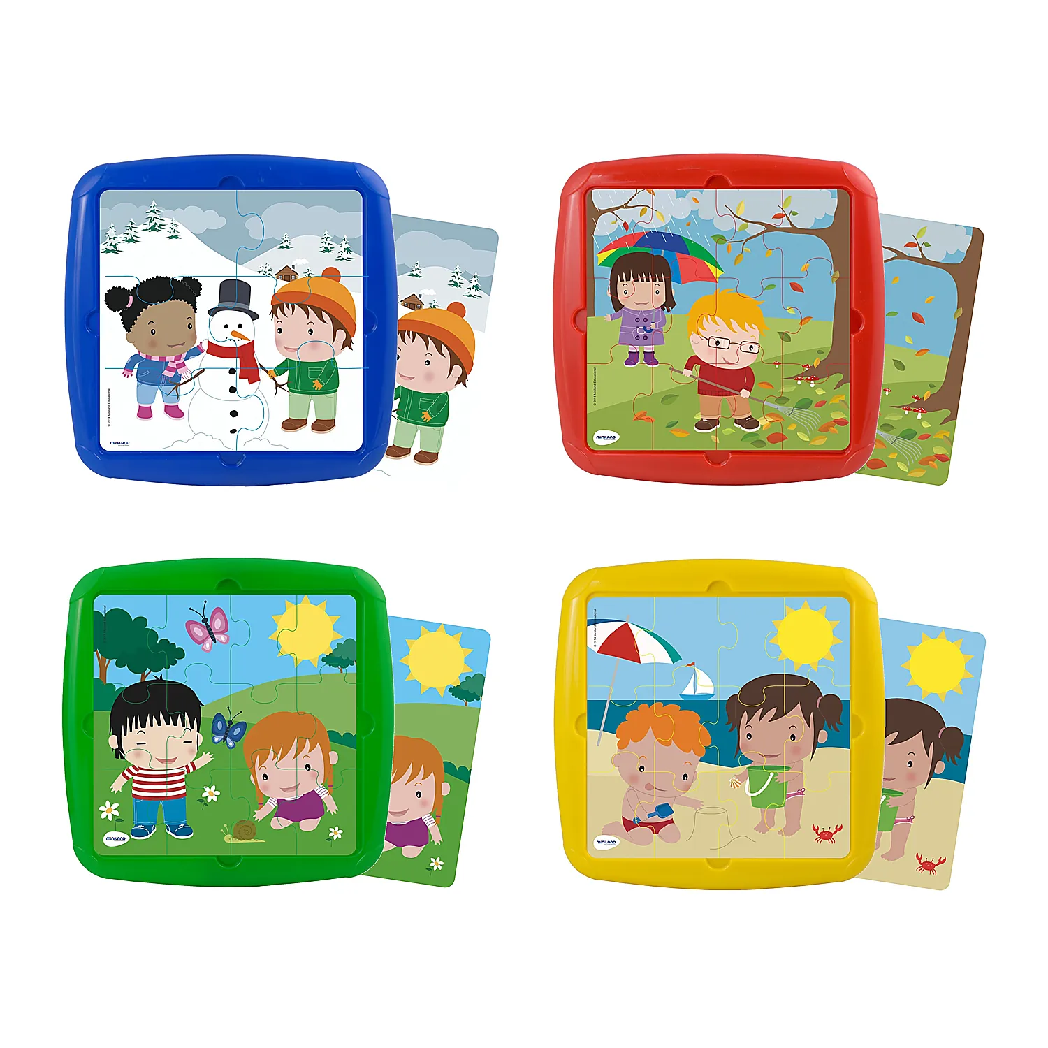 Setul include 4 puzzle-uri rezistente din plastic si 4 tavite cu rame colorate pentru potrivirea puzzle-urilor. Puzzle-ul ce reprezinta anotimpul iarna contine 6 piese, iar restul puzzle-urilor au fiecare cate 12 piese.