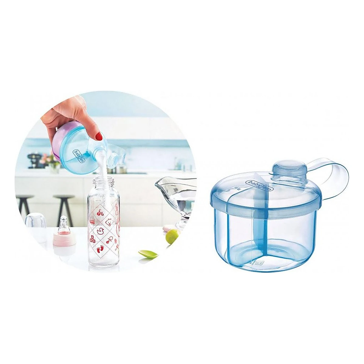 Este ideal atat pentru acasa cat si pentru calatorii: facand posibila prepararea usoara a unui biberon de lapte, prin simpla rasucire a capacului reipientului si varsarea dozei de lapte praf in biberon.