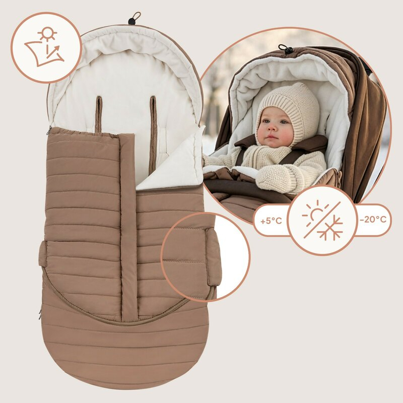 Baza intarita, cu material rezistent la murdarie, faciliteaza curatarea dupa fiecare plimbare. Croiala universala permite utilizarea sacului in majoritatea carucioarelor si landourilor, eliminand nevoia achizitionarii mai multor modele.