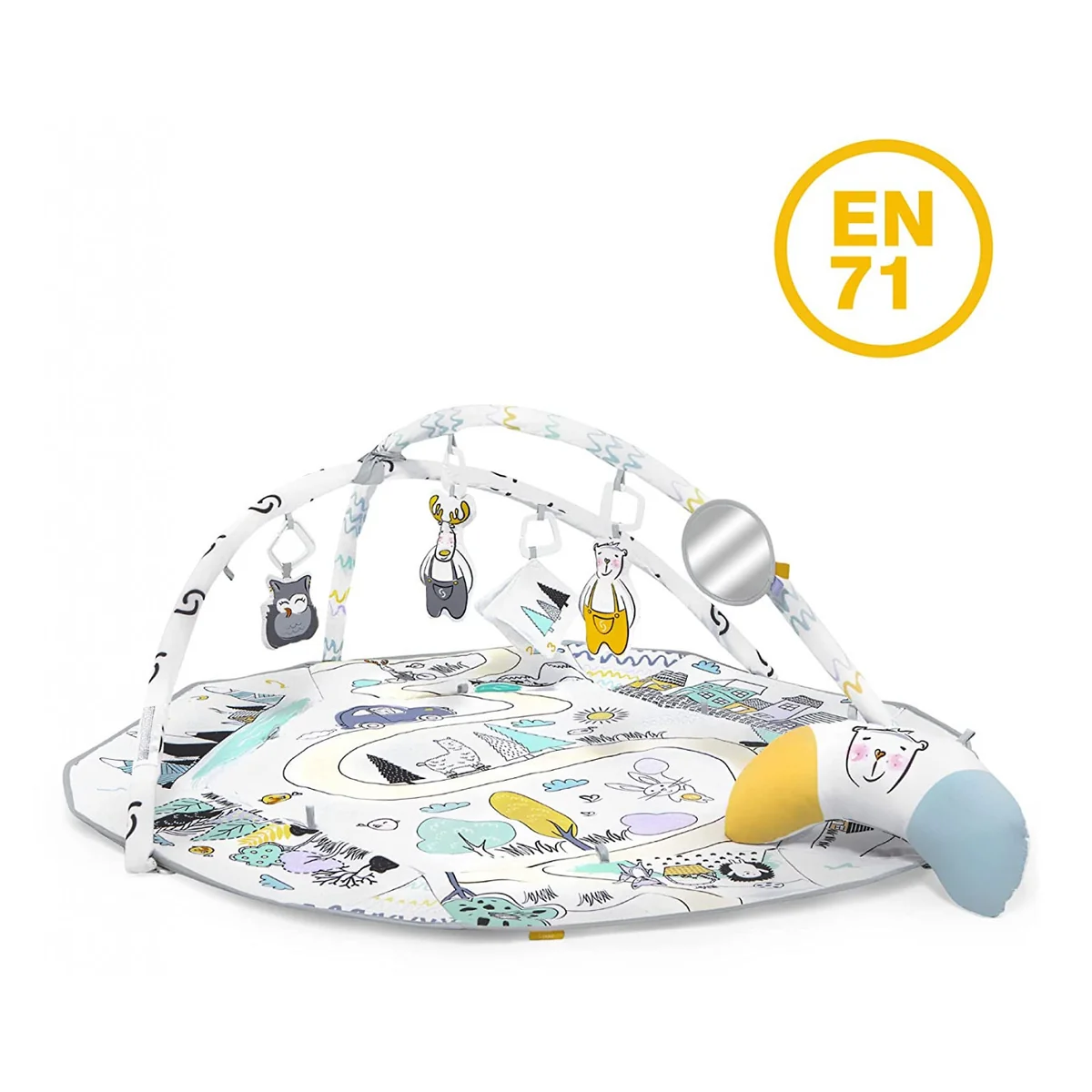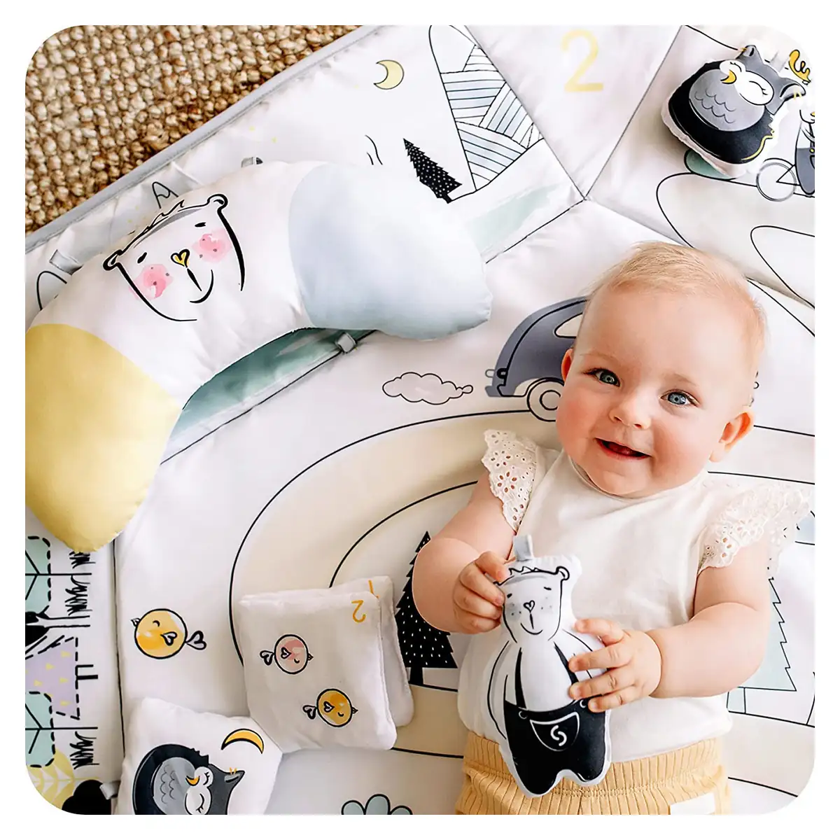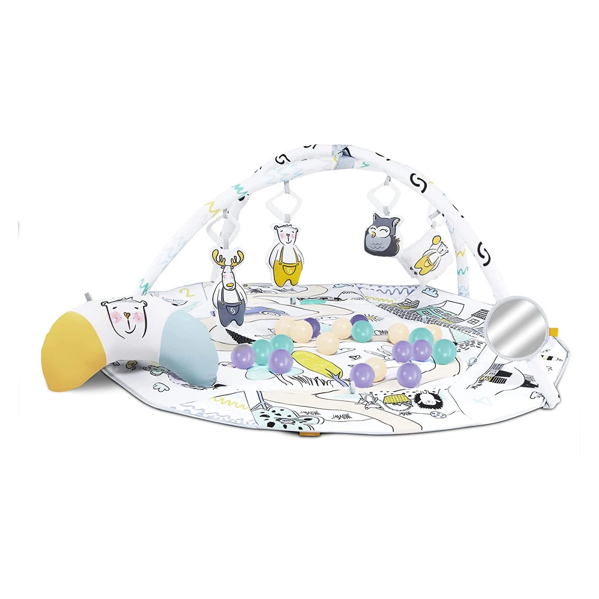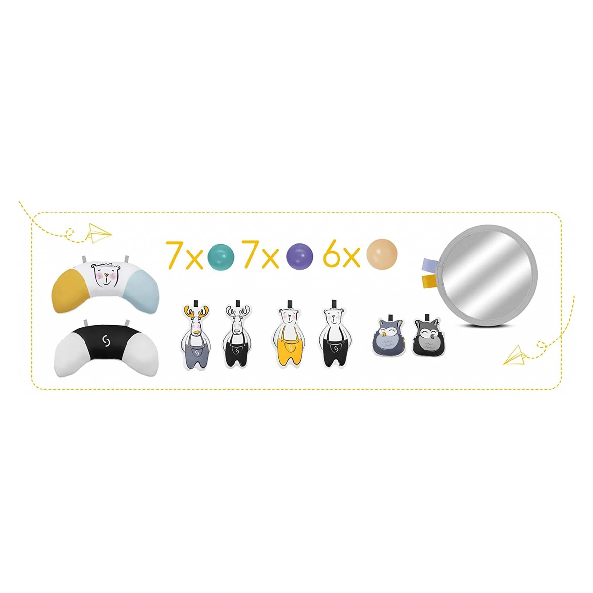 - covorasul vine impreuna cu: 2 arcade detasabile si reglabile, 3 jucarii interactive - urs, cerb si bufnita, o carticica senzoriala, o oglinda, 20 de bile de plastic si o pernuta pentru momentele in care bebelusul sta pe burtica