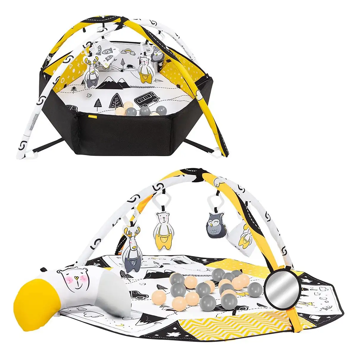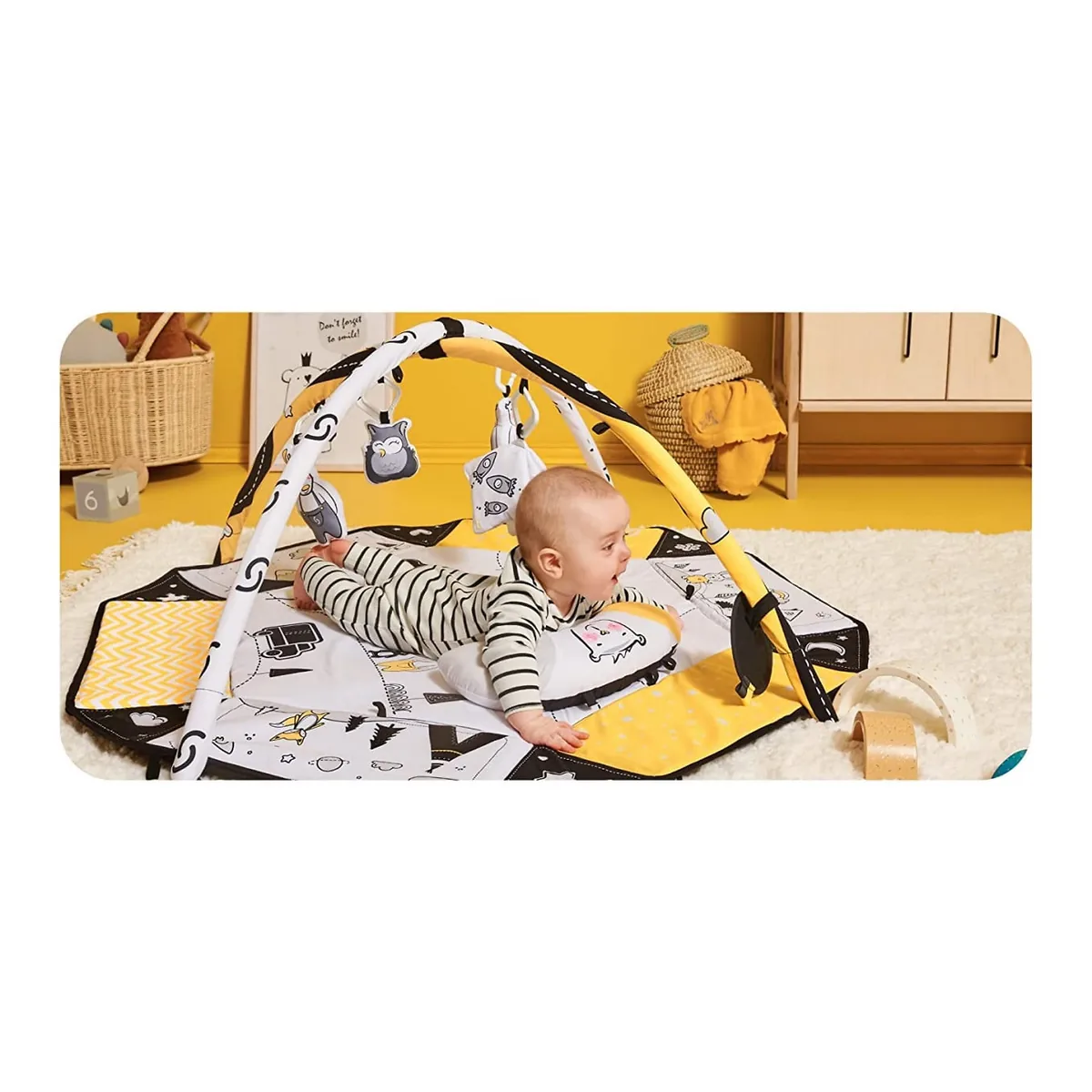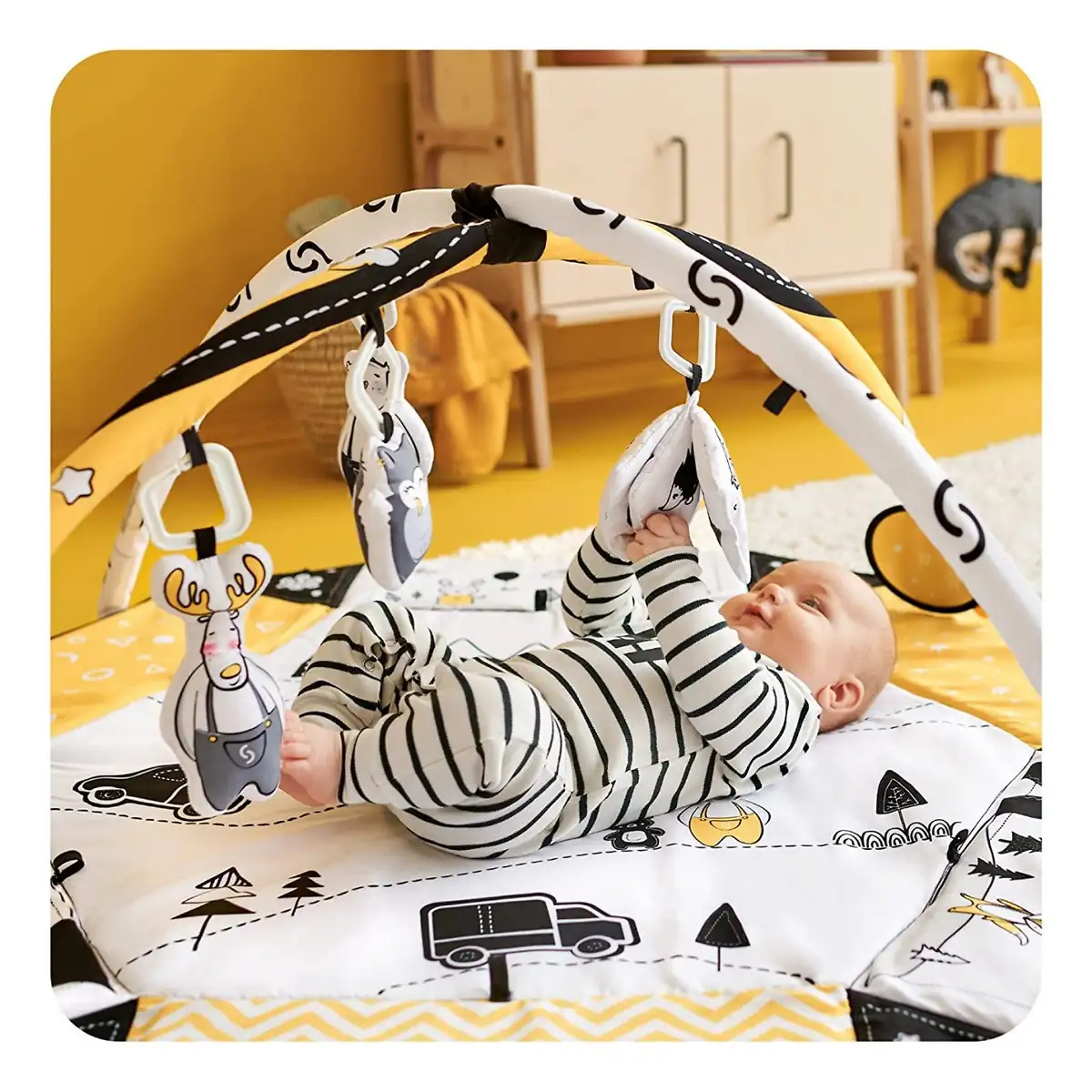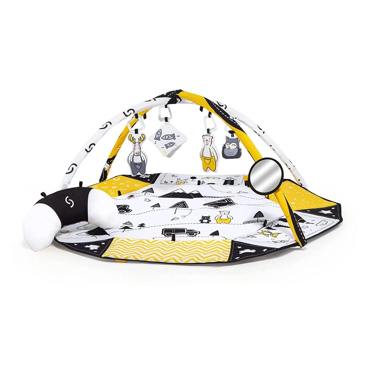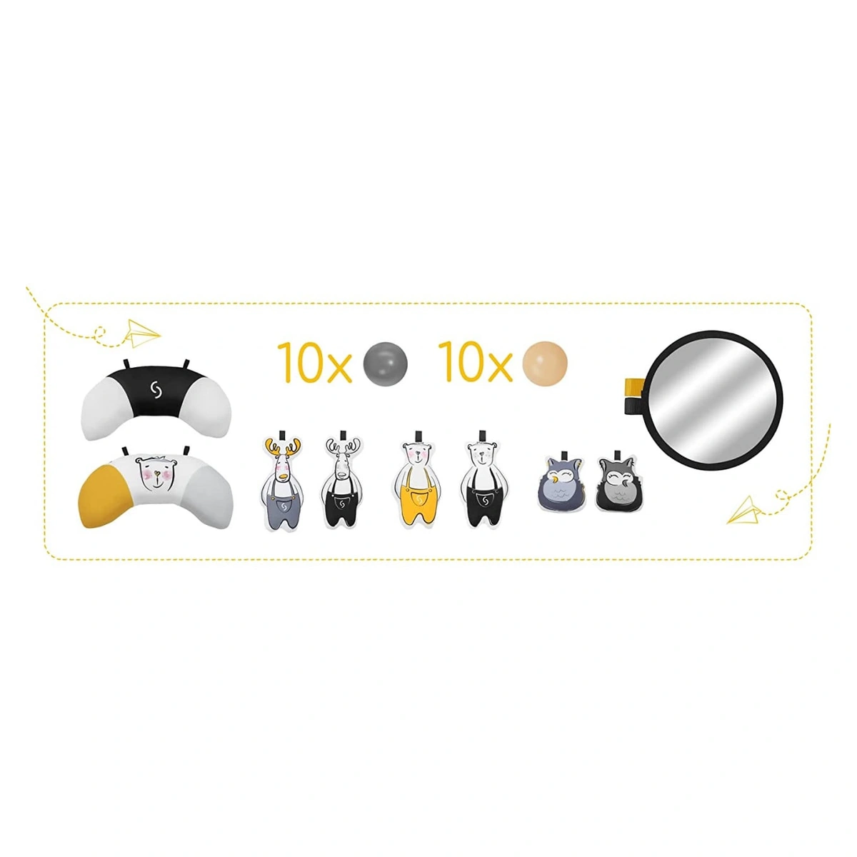 - covorasul vine impreuna cu: 2 arcade detasabile si reglabile, 3 jucarii interactive - urs, cerb si bufnita, o carticica senzoriala, o oglinda, 20 de bile de plastic si o pernuta pentru momentele in care bebelusul sta pe burtica