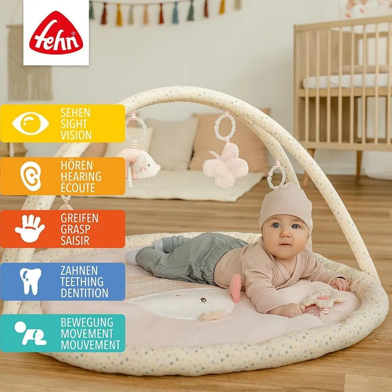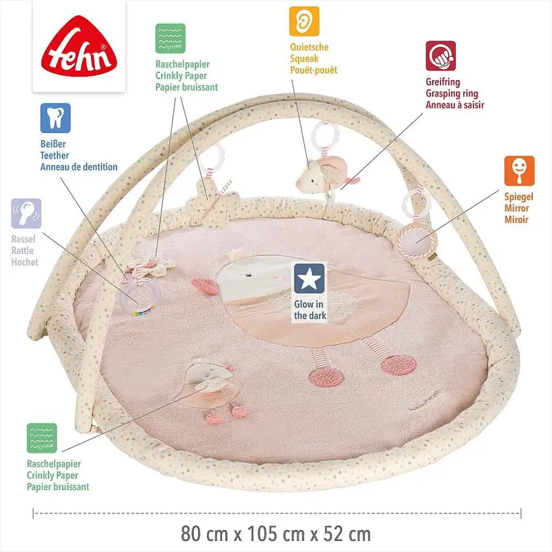 - Cu o suprafata moale si confortabila, realizata dintr-un amestec variat de materiale si texturi, aceasta salteluta este special creata pentru a stimula curiozitatea si explorarea bebelusului prin atingere si miscare