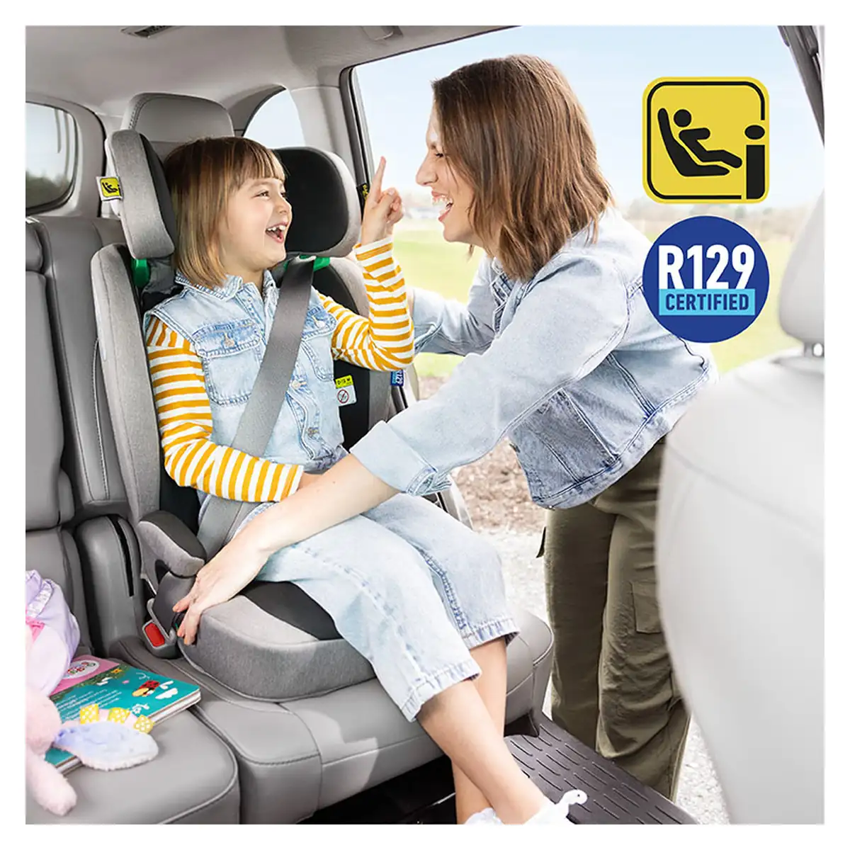 • Este certificat conform standardului R129 atat in modul scaun auto, cat si in modul inaltator cu spatar, garantand protectie conform celor mai recente reguli de siguranta.