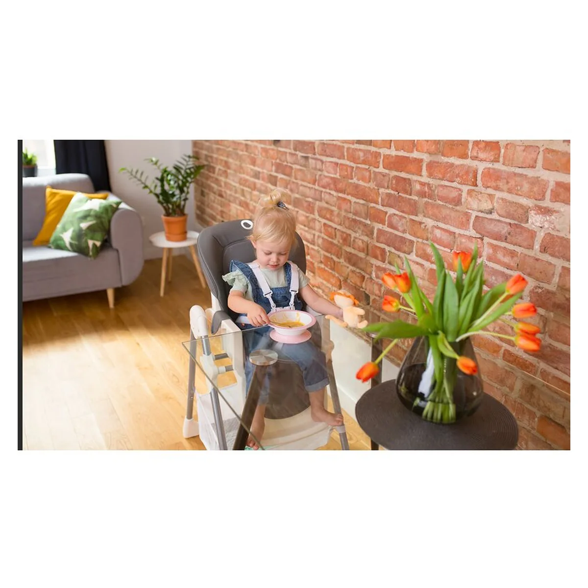 Scaunul de masa LINN PLUS are un design simplu, dar modern in acelasi timp si permite hranirea micutului rapid si usor.