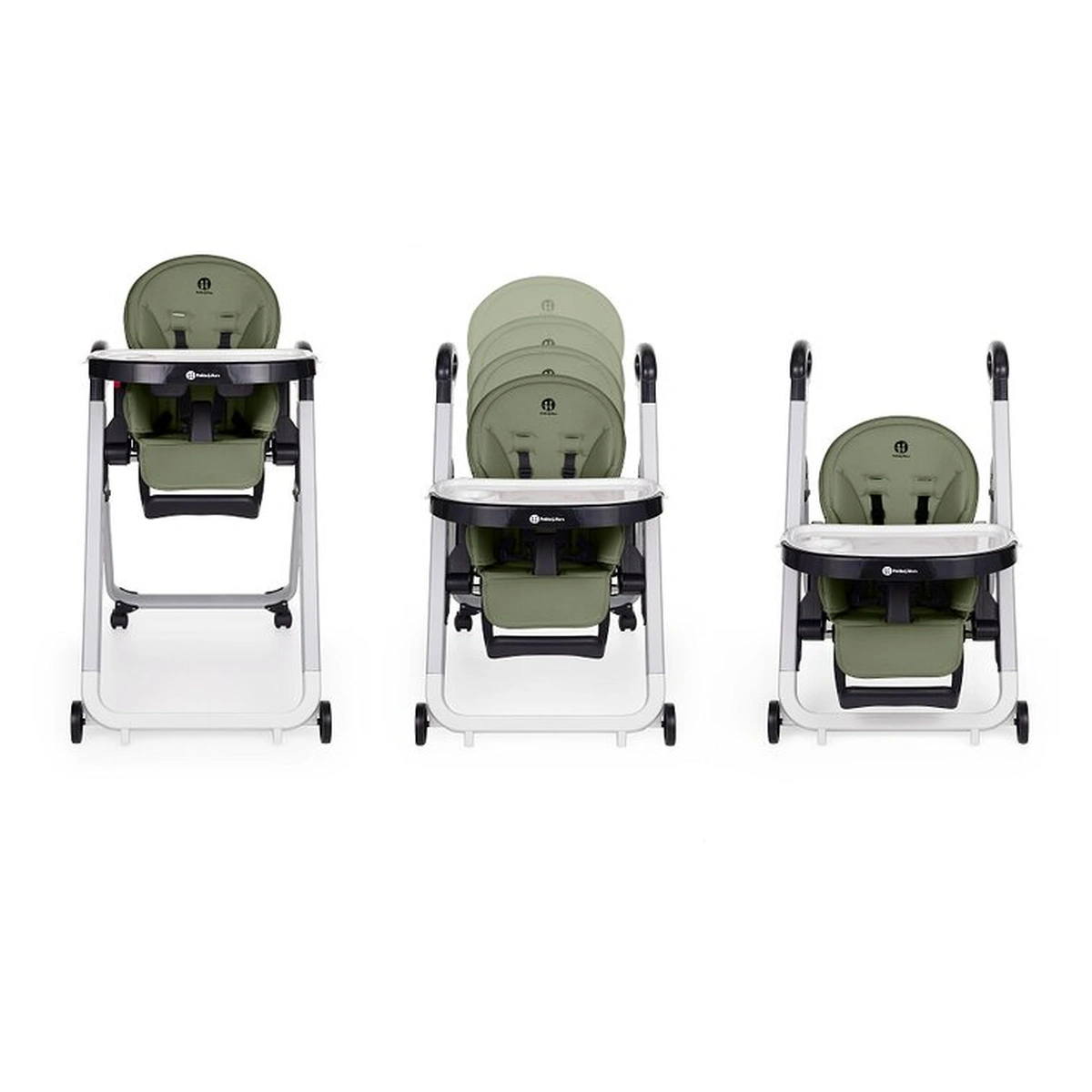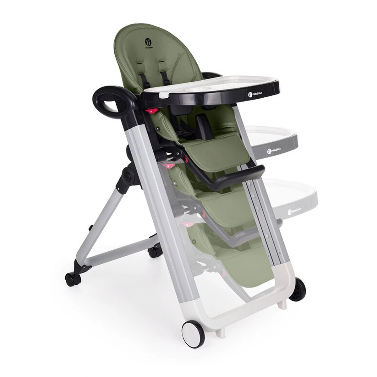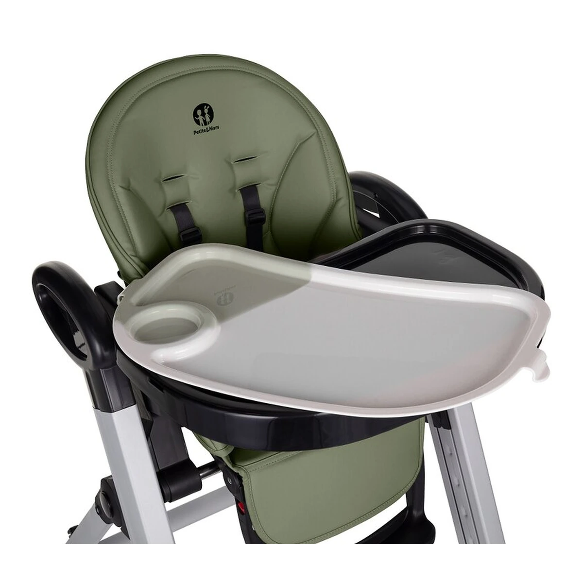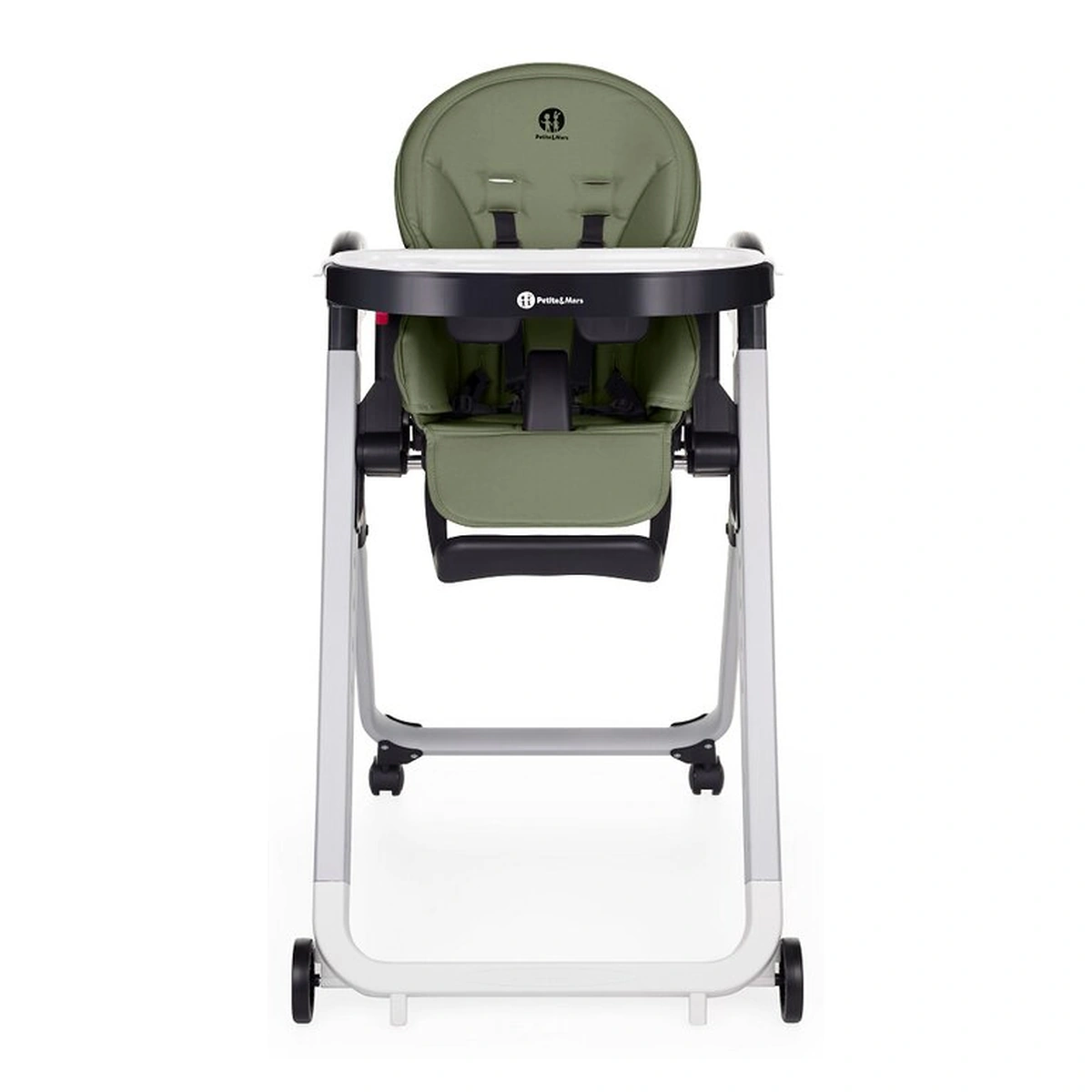 Scaun de masa, Petite&Mars, Tasty, Spatar, suport picioare si tavita reglabile, Cu roti, Mature Olive