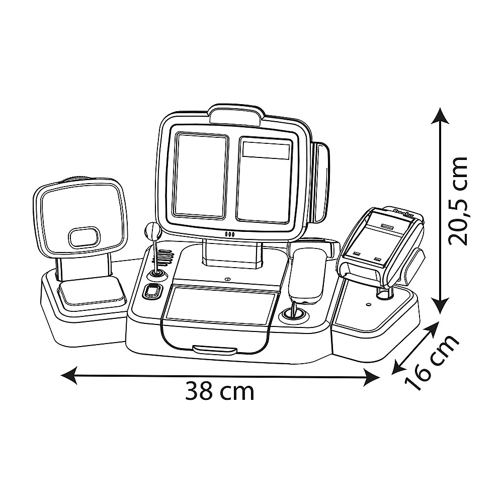 • Casa de marcat cu functii electronice, calculator cu display LCD integrat, scanner cu sunete si lumini, cantar mecanic, terminal card de credit cu imprimanta chitante, sertar bani, microfon (nefunctional, functie decorativa)