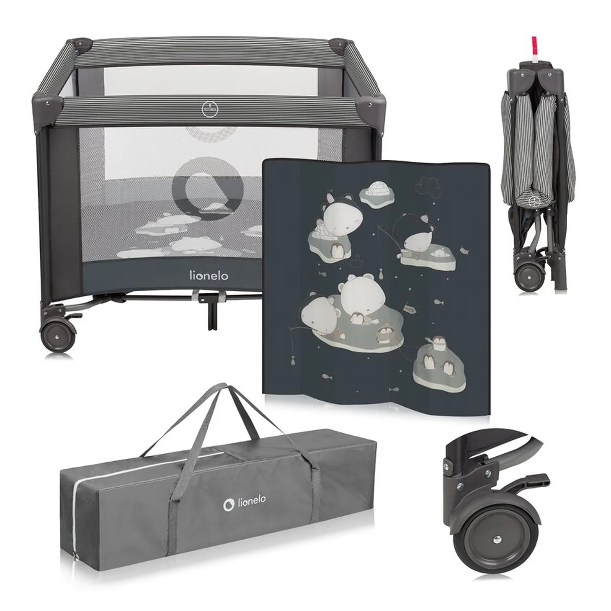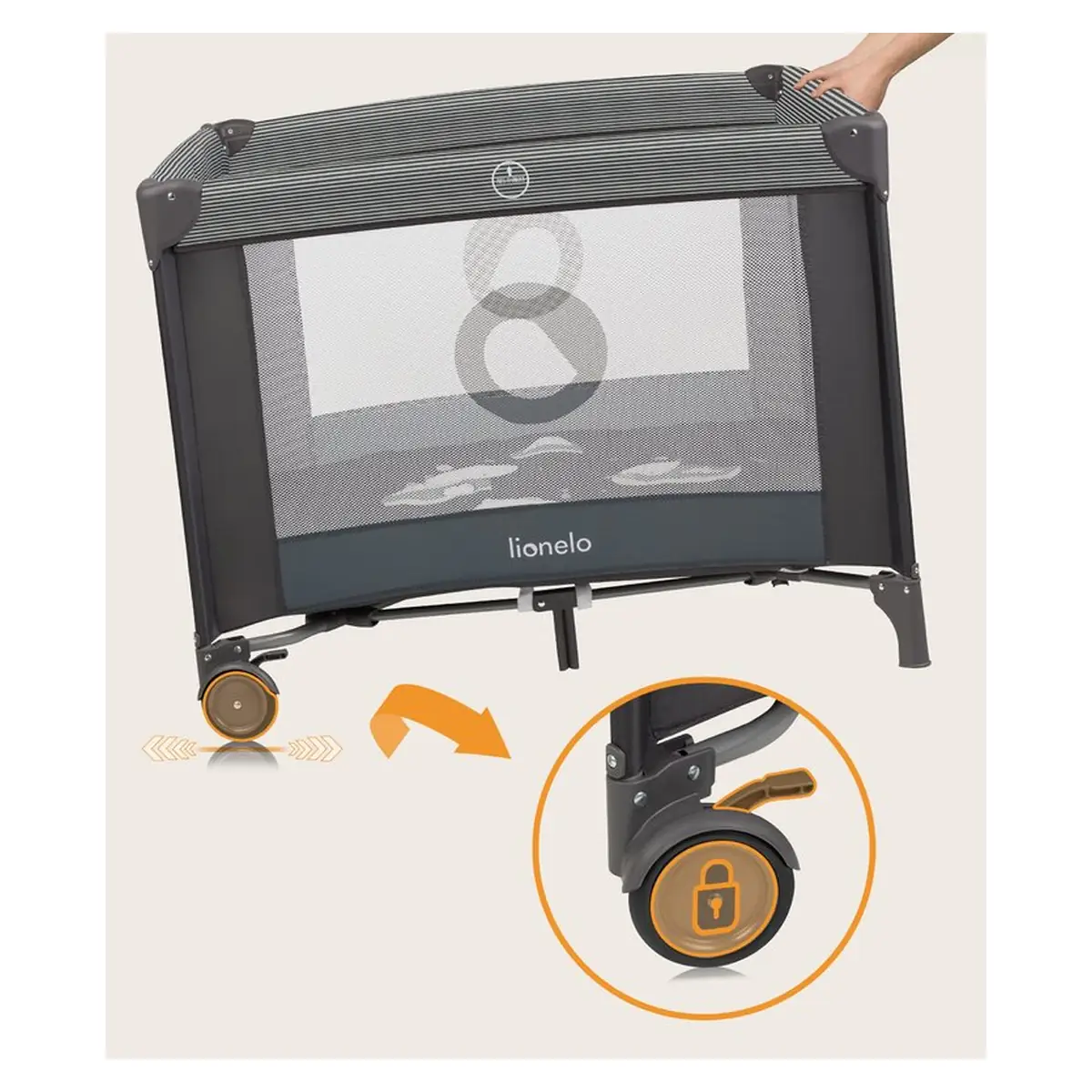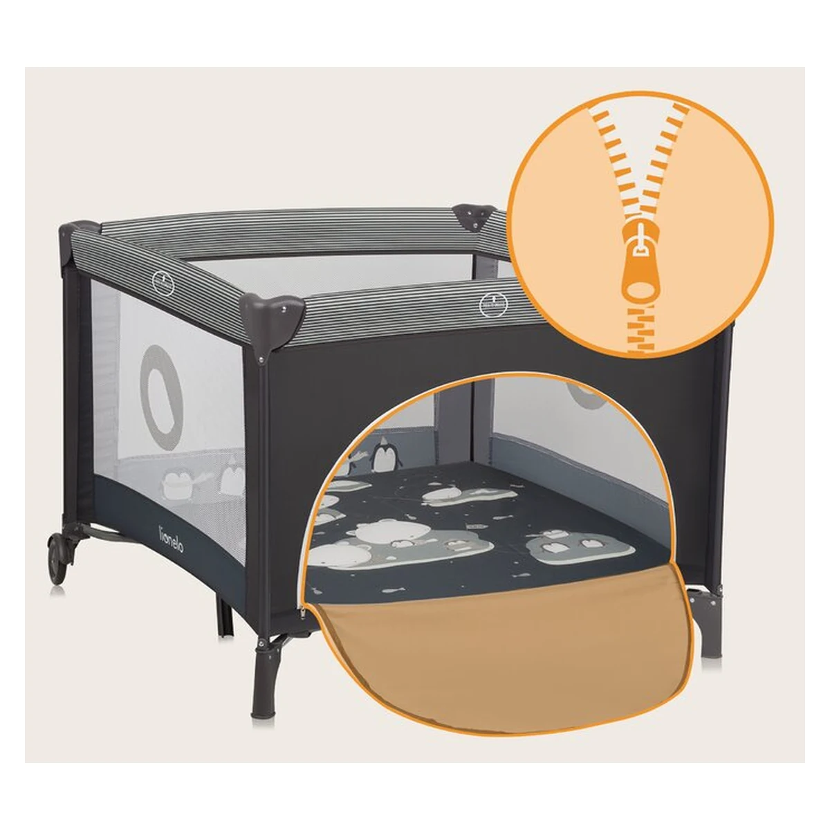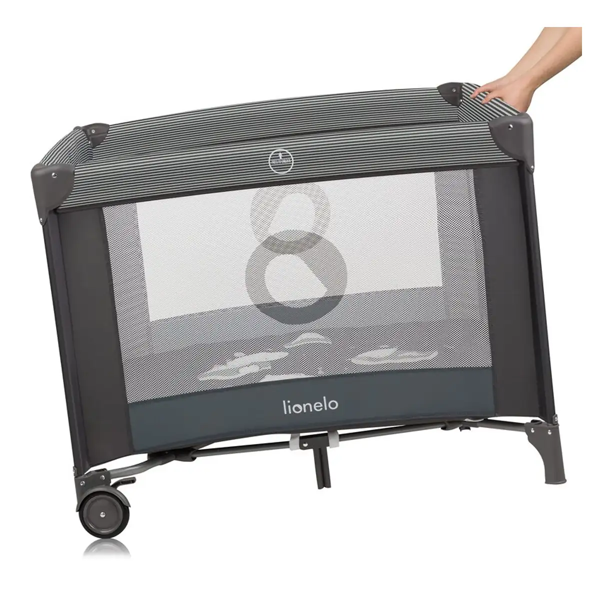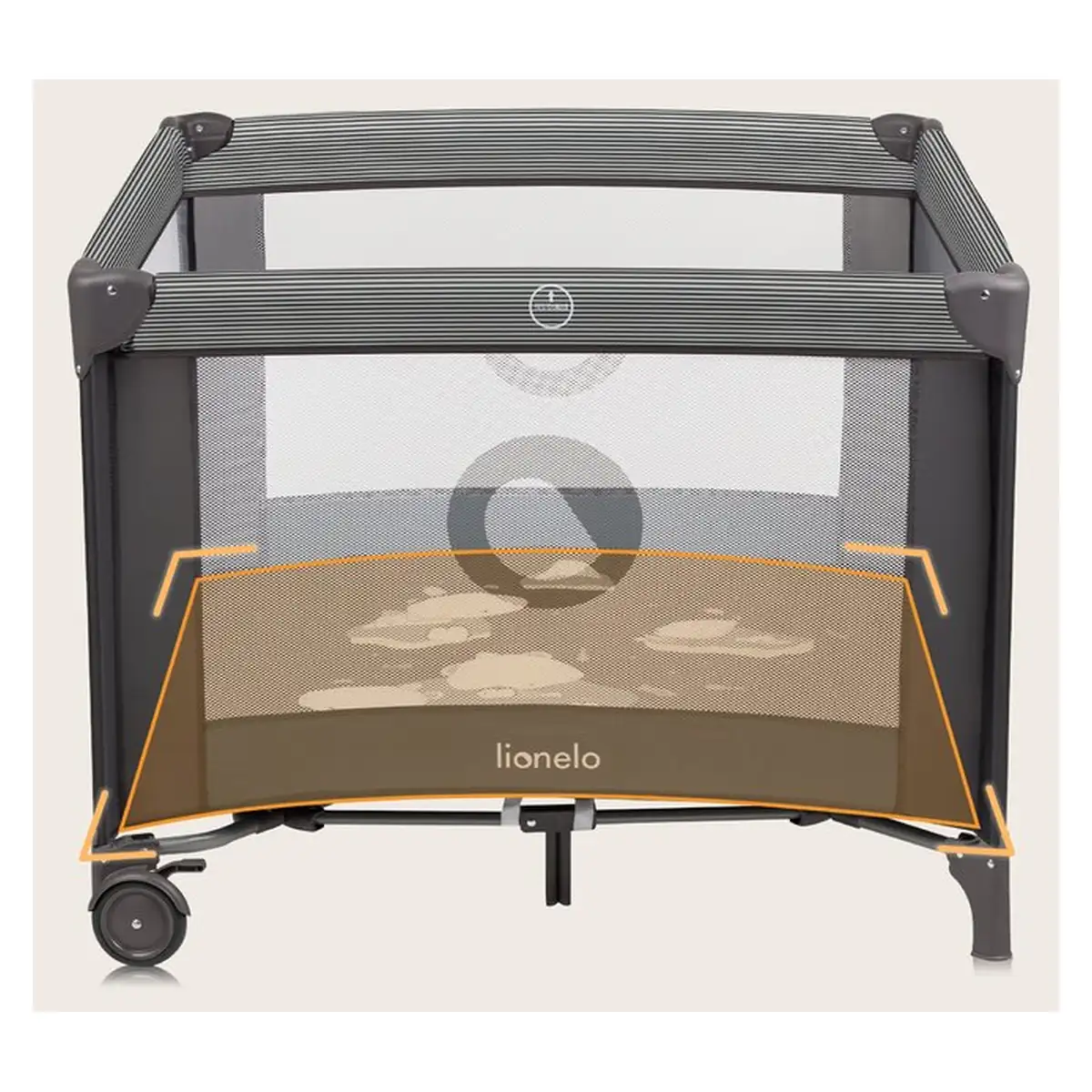 Lionelo Bonnie este un tarc de joaca functional pentru bebelusi, care le permite parintilor sa delimiteze o zona sigura pentru joaca si odihna pentru micutul lor. Dimensiunea mare asigura libertatea de miscare a copilului, in timp ce una dintre intrarile laterale, cu fermoar, permite copiilor mai mari sa intre si sa iasa din tarc singuri. Acest lucru nu doar ca ofera copilului un grad mare de independenta, dar si usureaza sarcina parintelui, care nu trebuie sa ridice si sa aseze copilul de fiecare data. Cu toate acestea, inchiderea este plasata pe exterior, astfel incat tarcul sa ramana sub controlul total al parintelui. Peretii laterali sunt confectionati dintr-o plasa speciala care garanteaza respirabilitatea si permite pastrarea contactului vizual intre copil si parinte. De asemenea, tarcul are o saltea speciala cu densitate T25, adaptata nevoilor copilului. 2 roti cu frane permit mutarea libera a tarcului conform nevoilor curente.