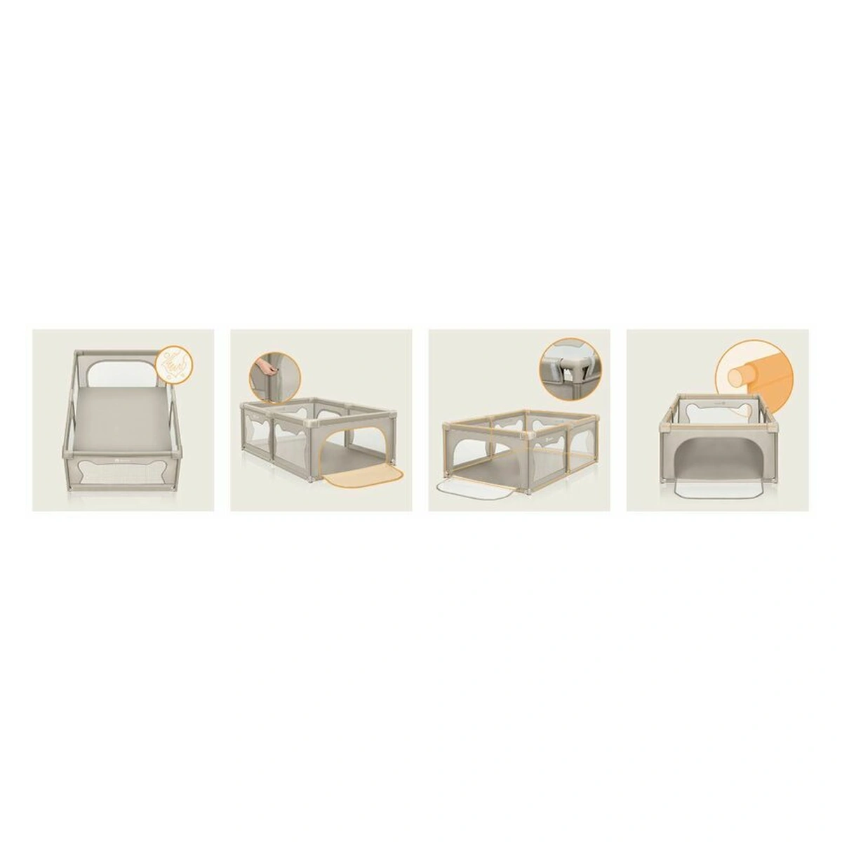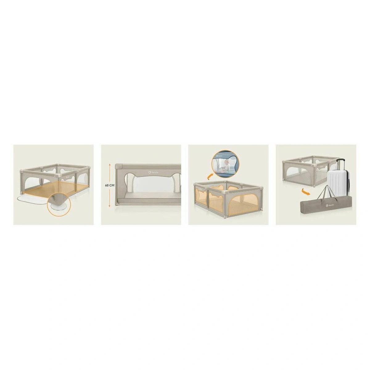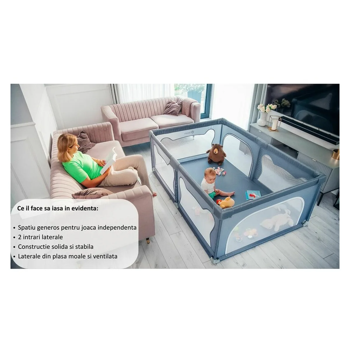 Datorita spatiului de joaca separat, parintele poate indeplini alte sarcini in timp ce copilul se afla intr-un loc sigur. Cele doua intrari laterale cu fermoar permit controlul deplin al spatiului - fermoarul este la exterior, astfel incat numai parintele poate decide sa le deschida. Produsul poate fi desfacut si pliat fara utilizarea uneltelor, iar dimensiunea compacta si geanta inclusa faciliteaza depozitarea. Materialul tarcului de joaca este usor de curatat, astfel incat produsul va dura multi ani.