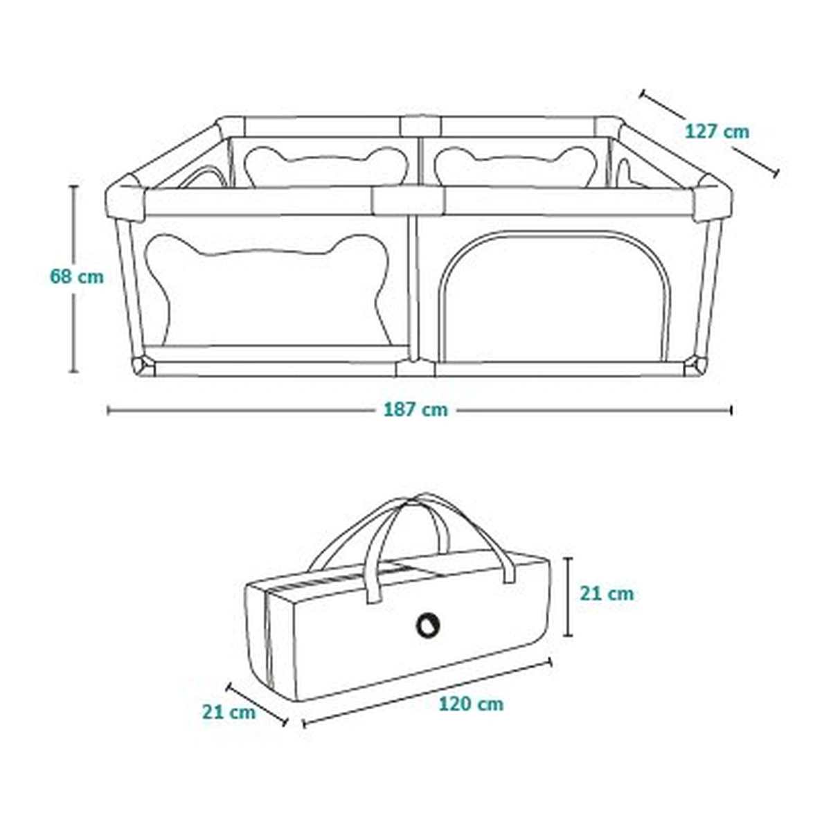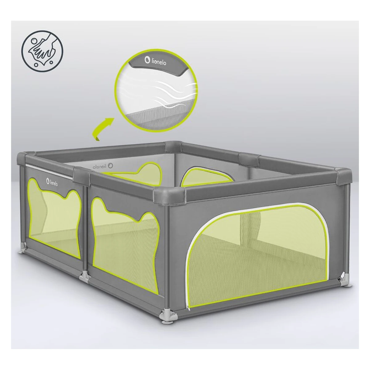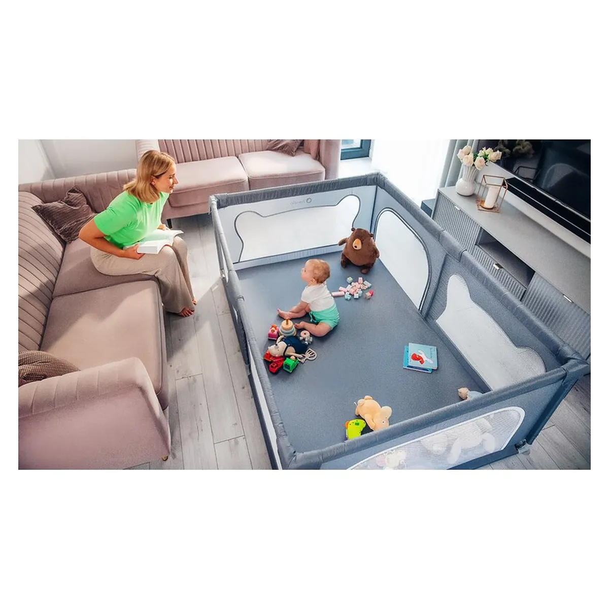 Laturile inalte ale tarcului de joaca sunt realizate din plasa, care nu numai ca asigura circulatia aerului, dar garanteaza si o buna vizibilitate, astfel incat parintele sa poata controla ce se intampla cu cel mic. Partile moi minimizeaza riscul unui posibil impact, iar designul asemanator urechilor de urs incurajeaza copiii sa se joace singuri in interiorul tarcului.