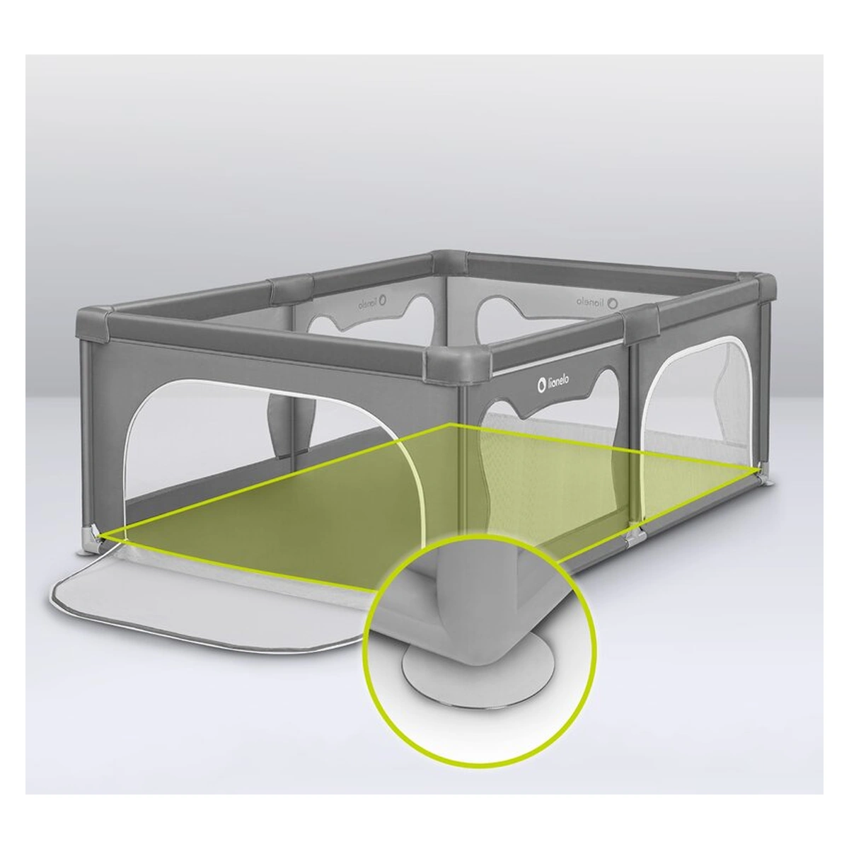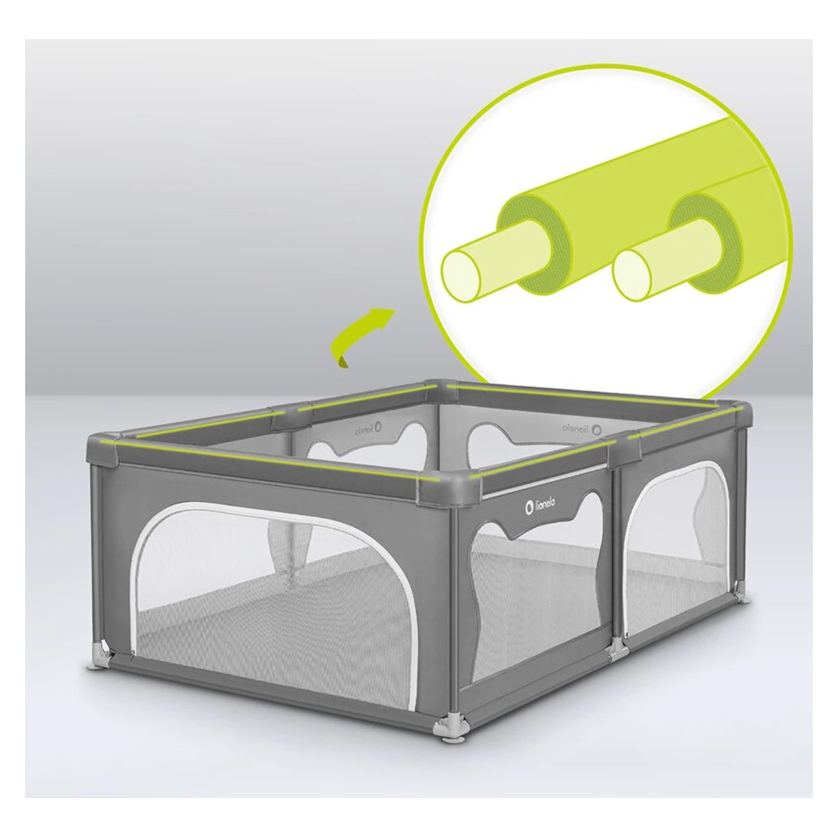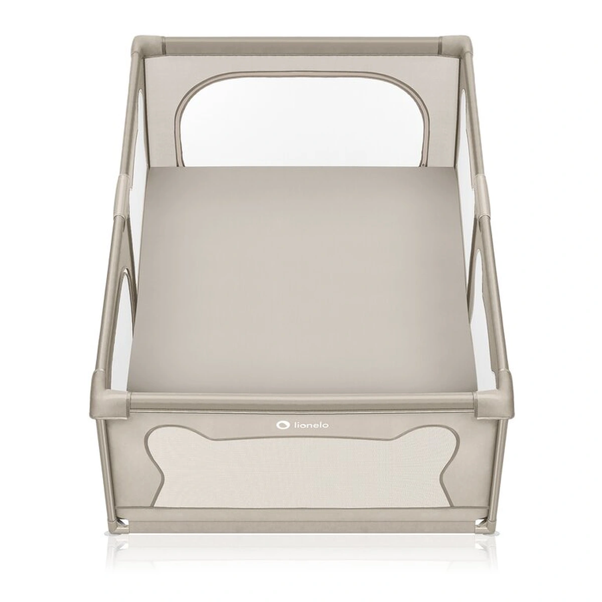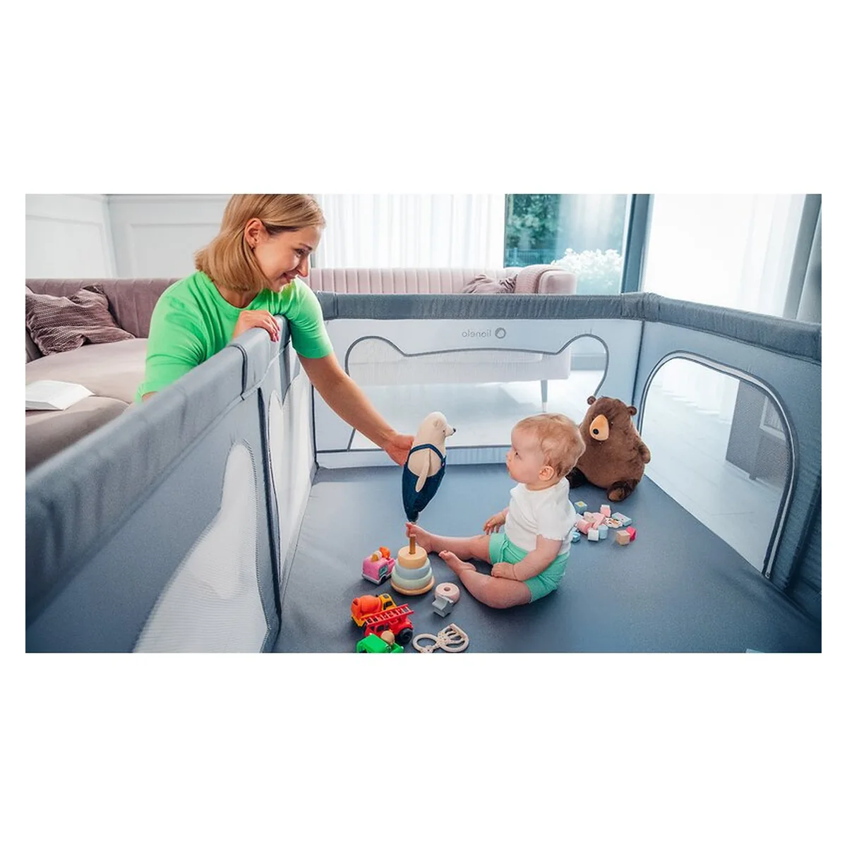 Laturile inalte ale tarcului de joaca sunt realizate din plasa, care nu numai ca asigura circulatia aerului, dar garanteaza si o buna vizibilitate, astfel incat parintele sa poata controla ce se intampla cu cel mic. Partile moi minimizeaza riscul unui posibil impact, iar designul asemanator urechilor de urs incurajeaza copiii sa se joace singuri in interiorul tarcului.