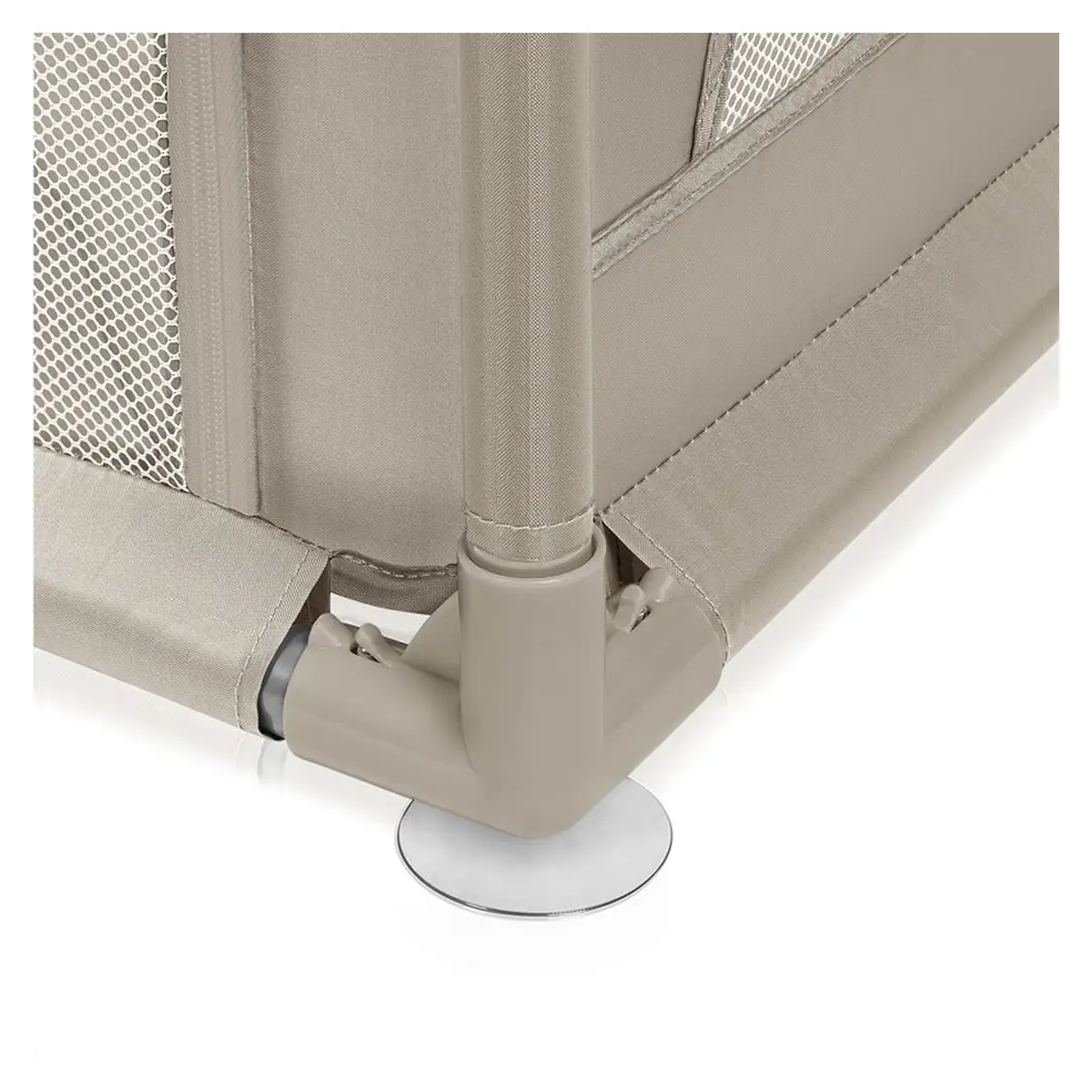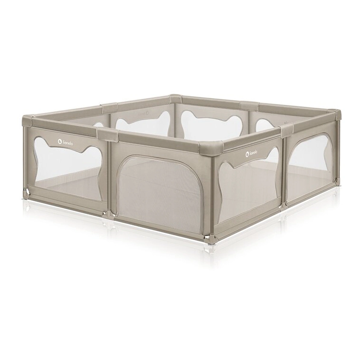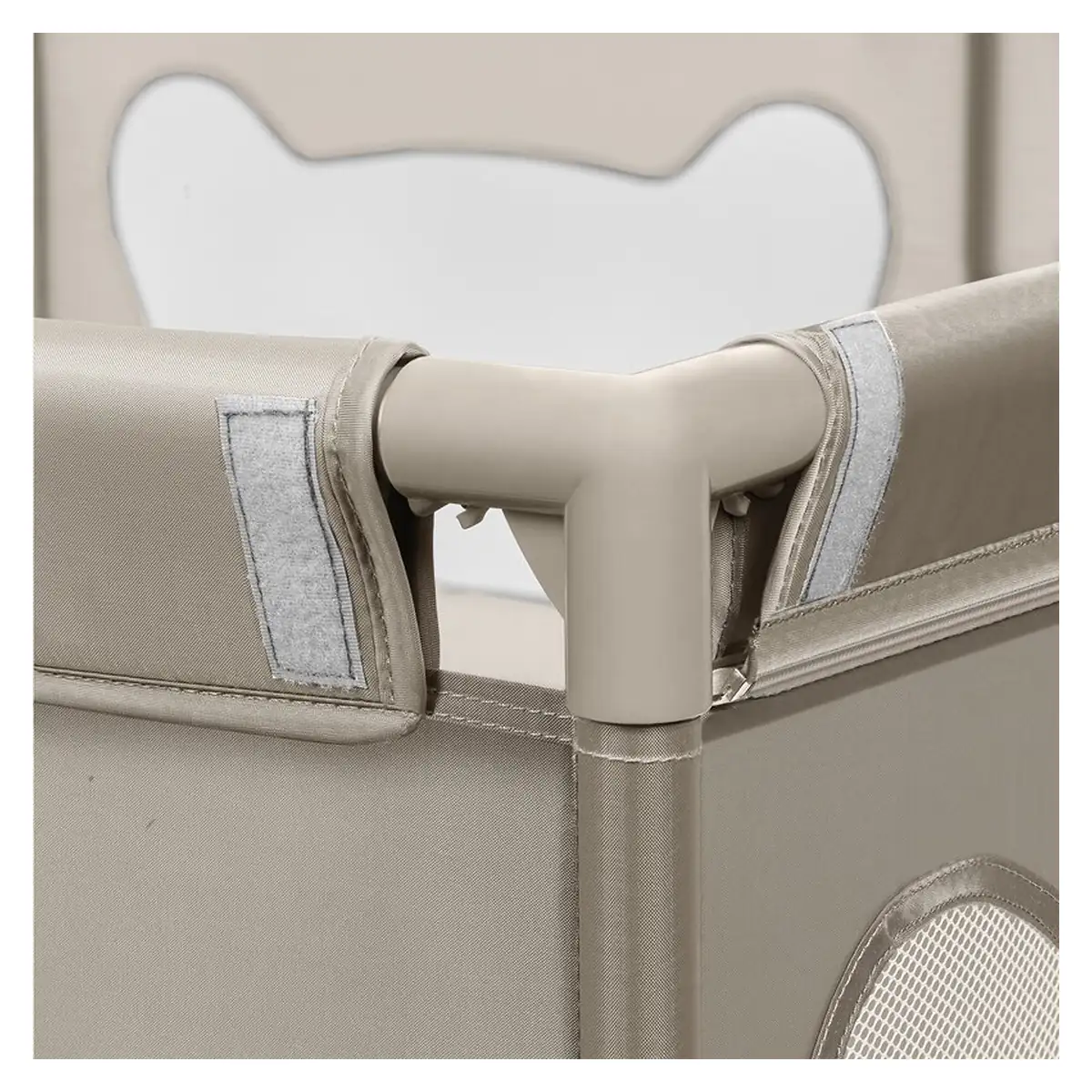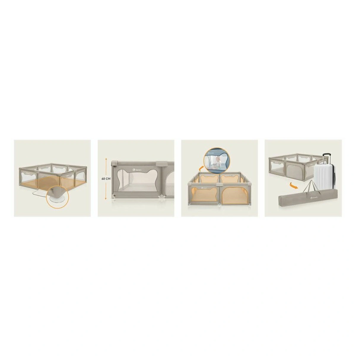 Laturile inalte ale tarcului de joaca sunt realizate din plasa, care nu numai ca asigura circulatia aerului, dar garanteaza si o buna vizibilitate, astfel incat parintele sa poata controla ce se intampla cu cel mic. Partile moi minimizeaza riscul unui posibil impact, iar designul asemanator urechilor de urs incurajeaza copiii sa se joace singuri in interiorul tarcului.