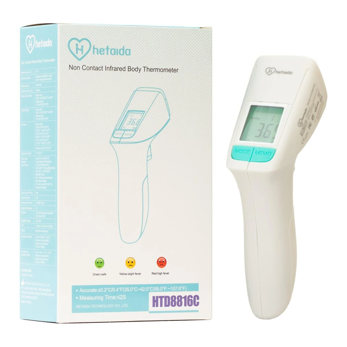 Termometrul Hetaida model HTD8816C este un termometru care citeste rapid cu ajutorul tehnologiei infrarosu temperatura corpului fara a trebui sa existe atingere directa dintre termometru si persoana masurata.