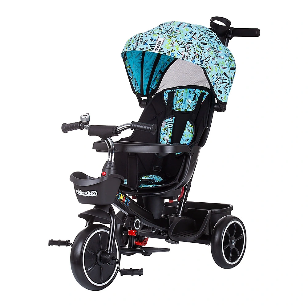 Cand tricicleta este impinsa de catre parinte, copii isi pot odihni picioarele pe suportul pentru picioare iar pedalele rotii din fata se pot dezactiva