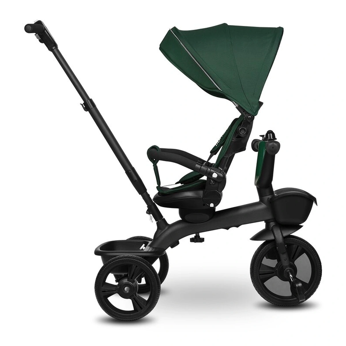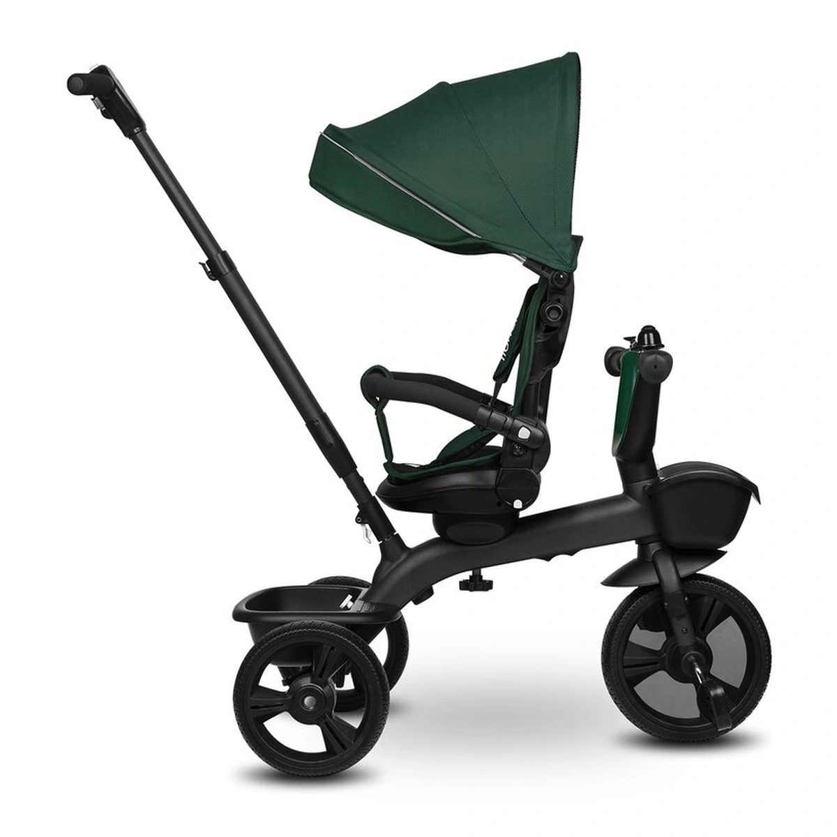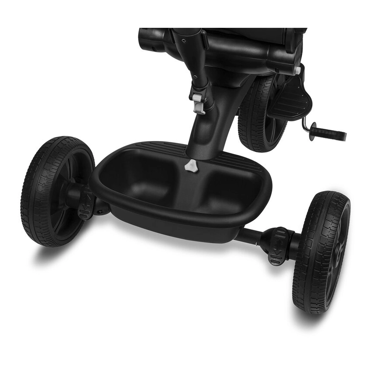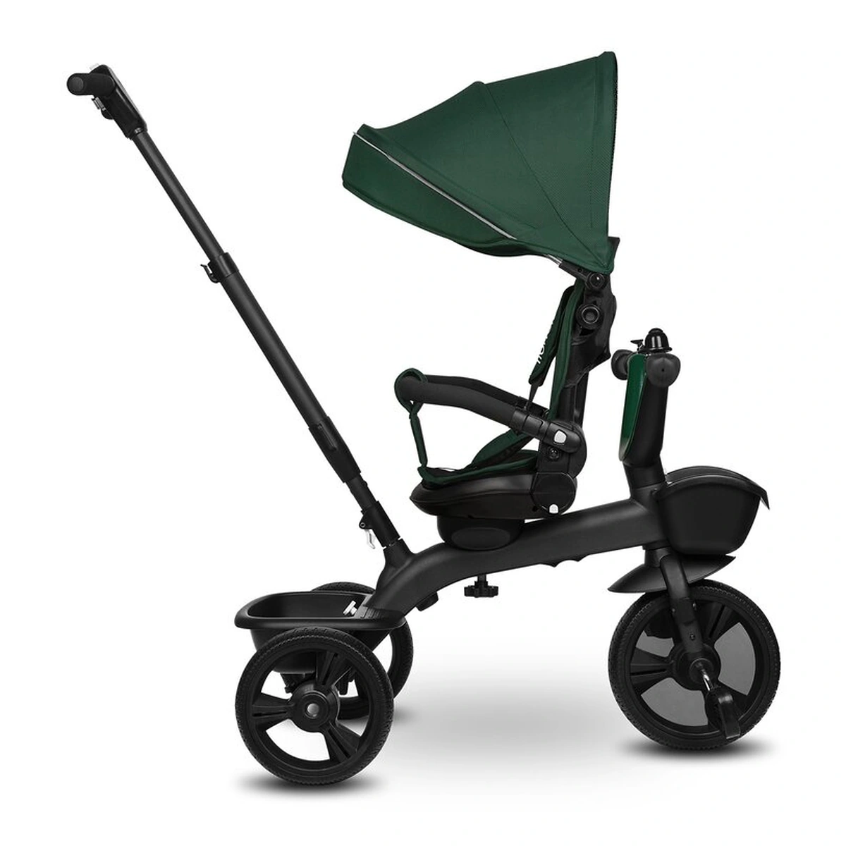 Vehiculul vine cu o copertina detasabila in 3 niveluri cu o plasa usoara integrata si o reglare a spatarului in 3 niveluri. Setul include, de asemenea, doua cosuri pentru articole indispensabile, precum si o geanta practica cu fermoar. In plus, manerul folosit pentru controlul produsului poate fi completat cu un suport pentru cana sau sticla.