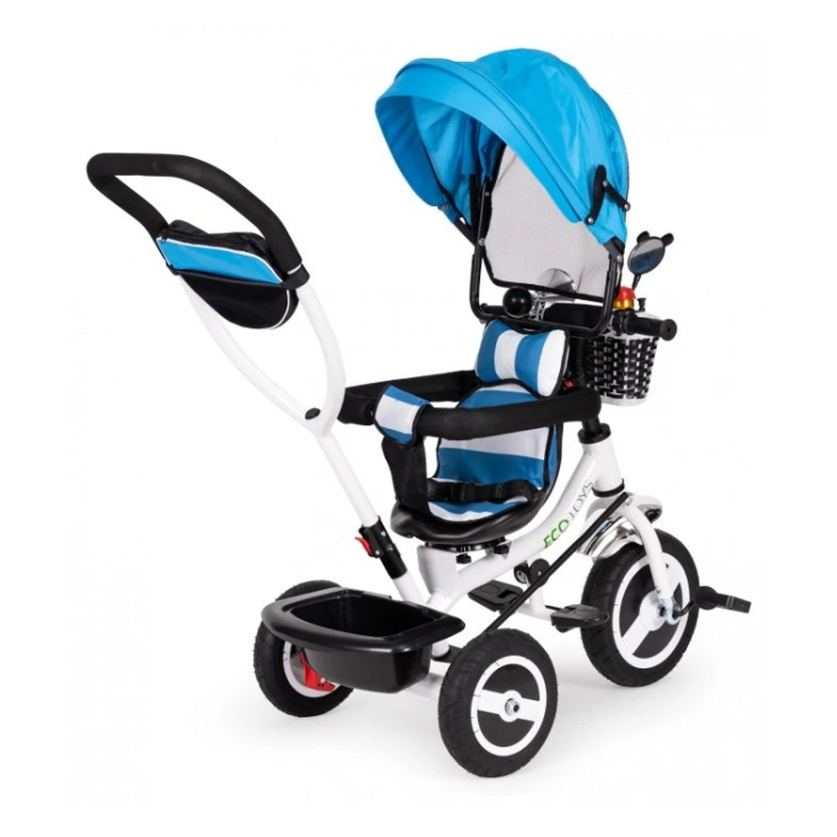 Tricicleta Ecotoys imbina functionalitatea si confortul atat pentru copil, cat si pentru parinte. Este dotata cu capotina retractabila si maner de ghidare, oferind control si siguranta in timpul plimbarilor. Cadrul metalic si rotile din cauciuc gonflabil asigura rezistenta si stabilitate, iar parasolarul detasabil protejeaza eficient impotriva soarelui, vantului si ploii.