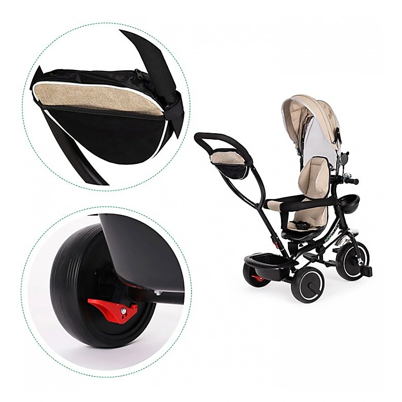 Mânerul conectat la volan permite părintelui control complet asupra direcției, iar frânele independente de pe roțile din spate cresc siguranța. Scaunul rotativ la 360° poate fi orientat către părinte sau înainte, sprijinind dezvoltarea coloanei și menținând contactul vizual atunci când este necesar.