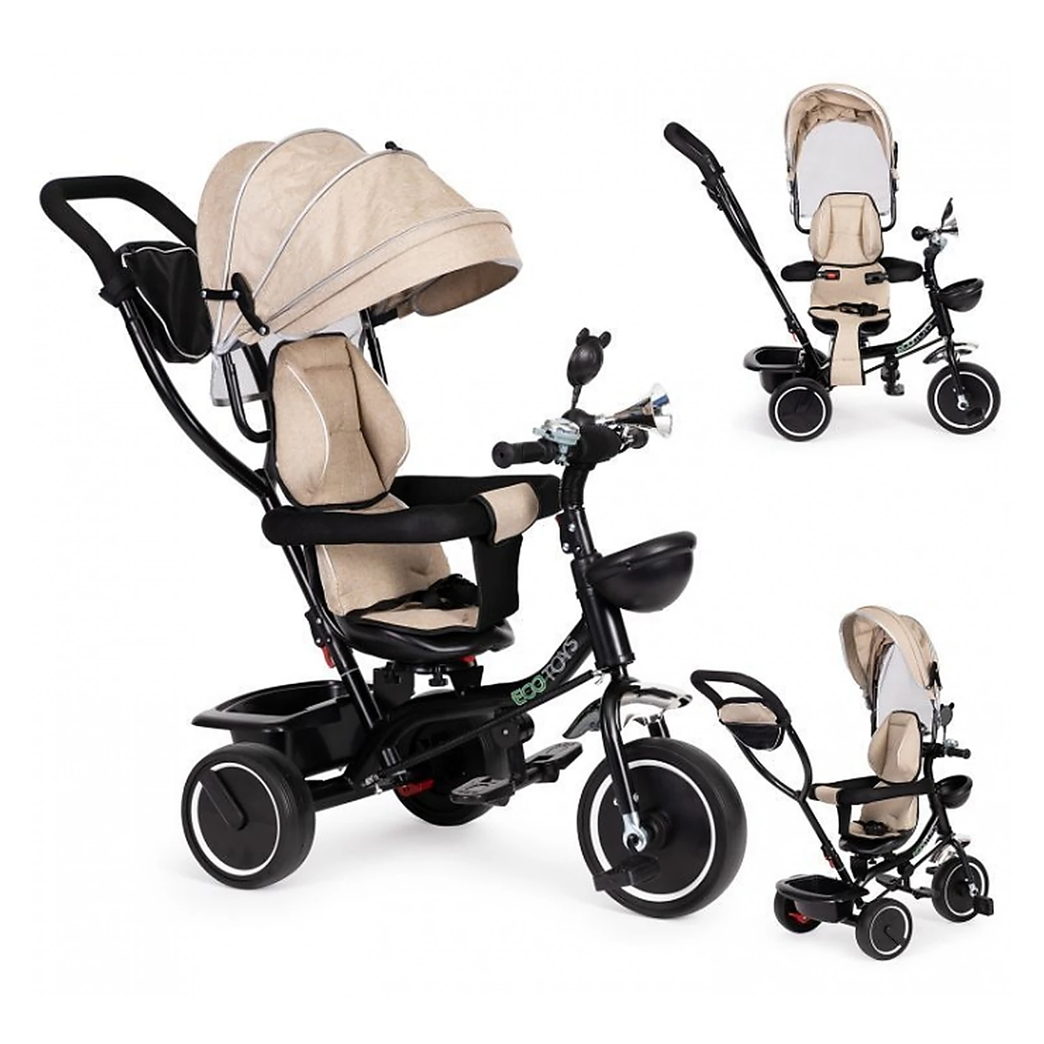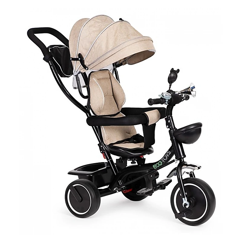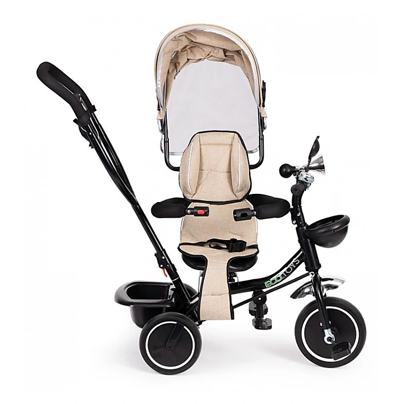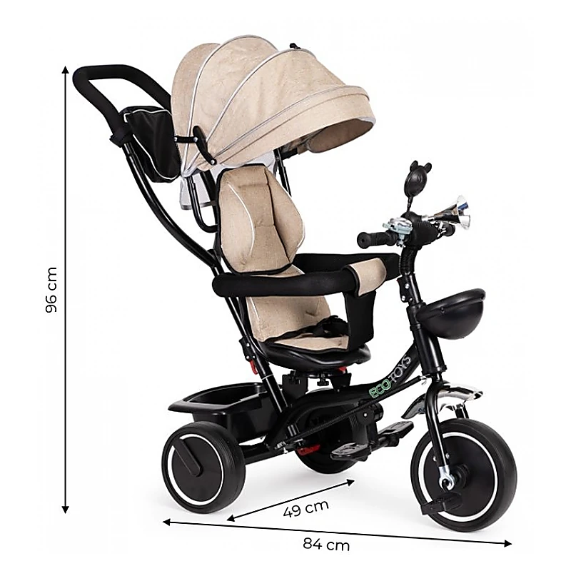 Tricicleta Ecotoys oferă confort atât copilului, cât și părintelui, fiind prevăzută cu capotină retractabilă și mâner de ghidare a direcției. Construită pe cadru metalic și echipată cu roți durabile din spumă EVA (fără camera de aer), tricicleta îmbină funcțiile de cărucior, asigurând protecție împotriva soarelui, vântului și ploii prin parasolarul integrat.