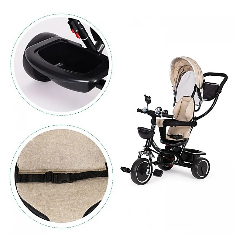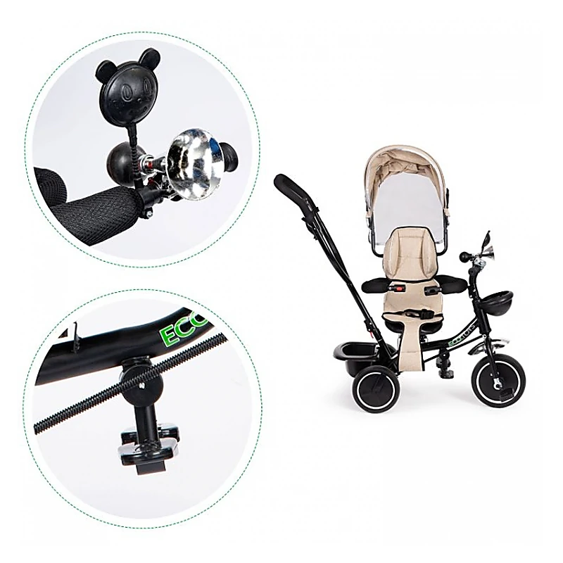 Pentru confort suplimentar, tricicleta este dotată cu spătar ergonomic, suport pentru picioare pliabil, mânere anti-alunecare, pedale cu cauciuc, clopoțel și oglindă retrovizoare. Coșulețele practice și gentuța mini permit transportul accesoriilor sau jucăriilor. Parasolarul ajustabil oferă protecție în timpul plimbărilor, indiferent de vreme.