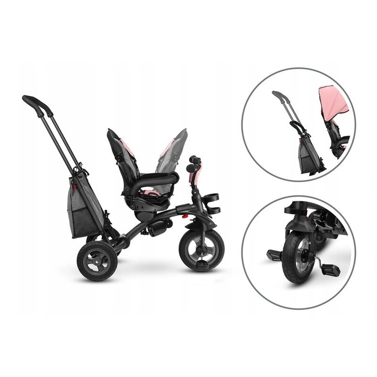 Rotile usoare ale modelului Tris, realizate din material PU de inalta calitate, asigura o aderenta excelenta si o absorbtie a socurilor. Deasupra rotii din fata exista un capac care protejeaza picioarele copilului si, de asemenea, actioneaza ca o aripa. Vehiculul are o capotina cu plasa integrata, care, la fel ca suportul pentru picioare si bara de protectie, poate fi usor demontat.