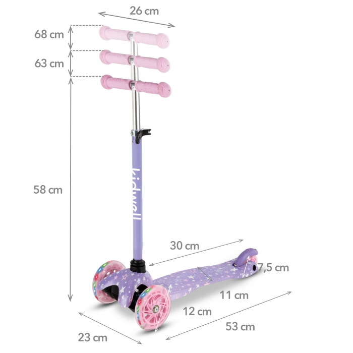 Trotineta UNO cu trei roti este perfect echilibrata, stabila si va deveni cu siguranta partenerul de joaca al copilului tau. Rotile cu LED iluminate si designul interesant vor incanta fiecare mic utilizator.